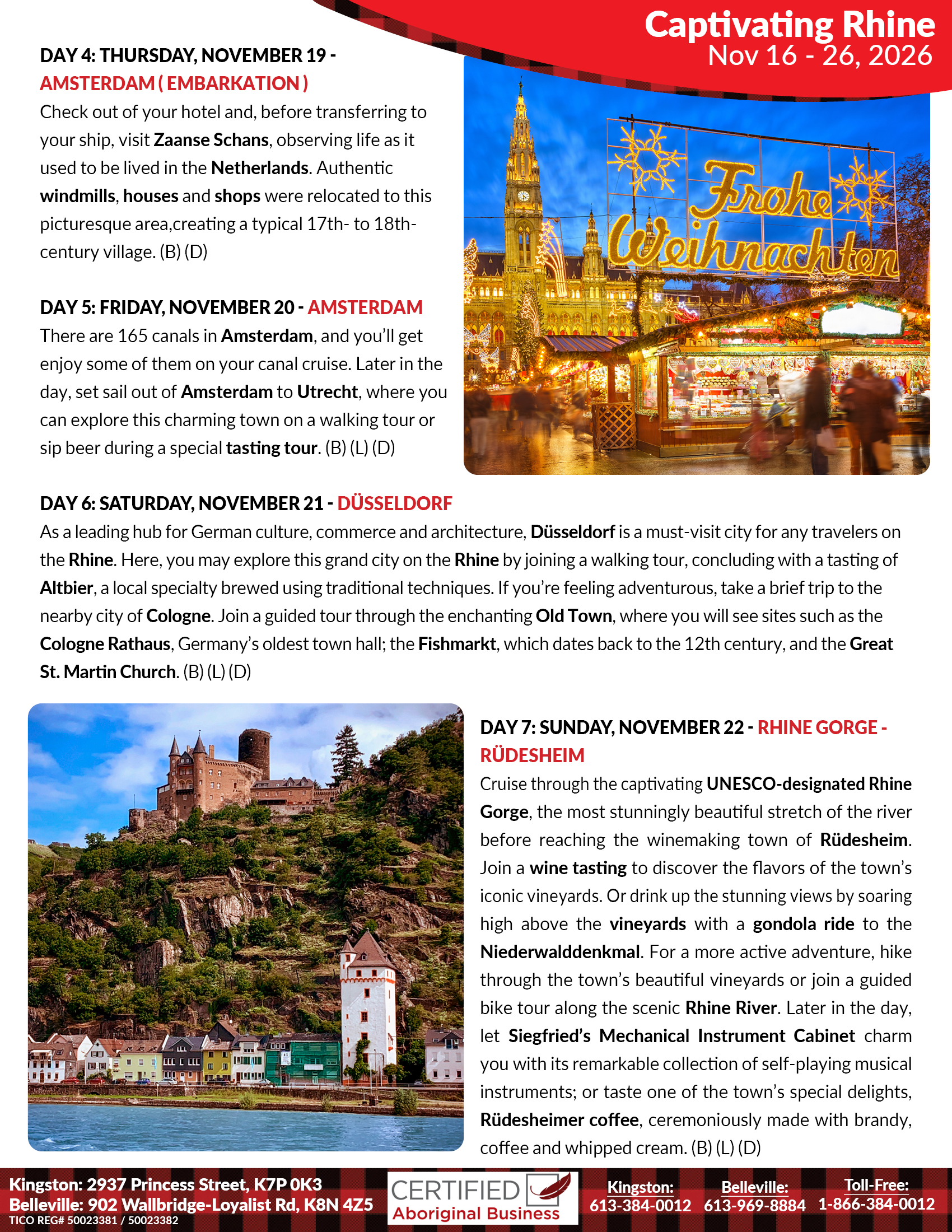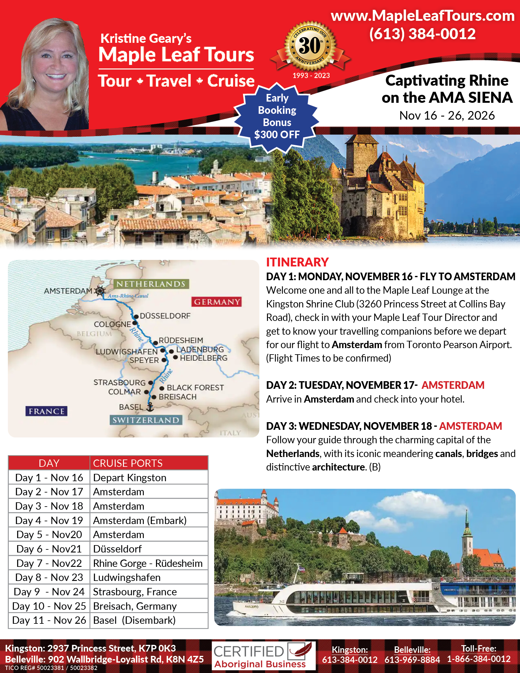 Welcome one and all to the Maple Leaf Lounge at the Kingston Shrine Club (3260 Princess Street at Collins Bay Road), check in with your Maple Leaf Tour Director and get to know your travelling companions before we depart for our flight to Amsterdam from Toronto Pearson Airport. (Flight Times to be confirmed)