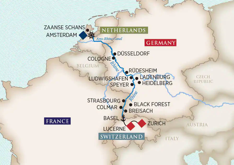 Contoured by vineyard-clad hills and castles from yesteryear, the legendary Rhine captivates. Experience the allure of France’s Alsace region in its welcoming capital, Strasbourg, and its priceless gem, Riquewihr. Discover Breisach, rising above the vineyards of the Rhine, and Freiburg, one of Germany’s sunniest cities and gateway to the Black Forest. Fabled towns lost in time present you with the chance to taste local flavors—Rüdesheimer coffee and legendary German beer—and to touch history up close with guided hikes and bike rides. From Amsterdam’s colorful canals to the majestic Swiss Alps, journey into the heart of the destinations you visit.