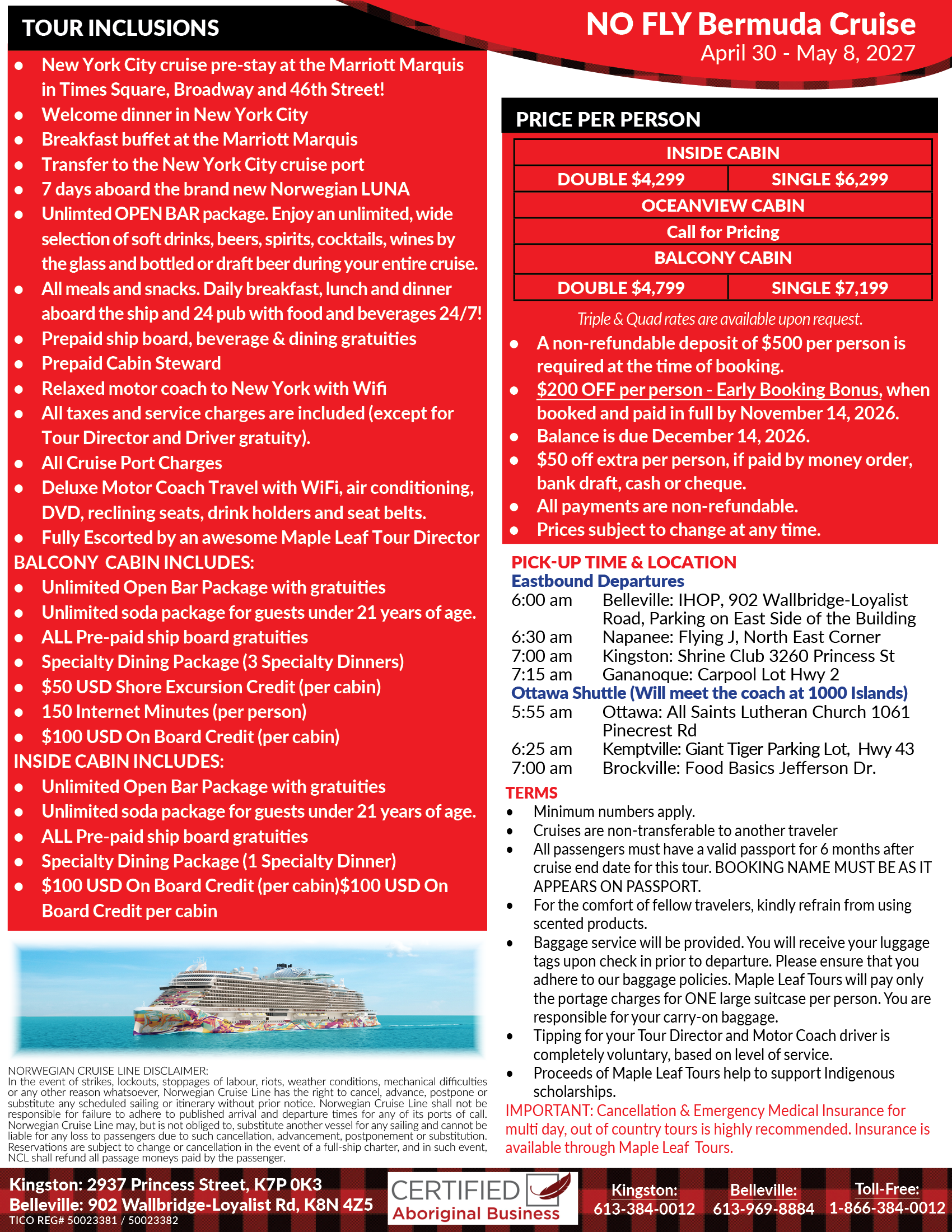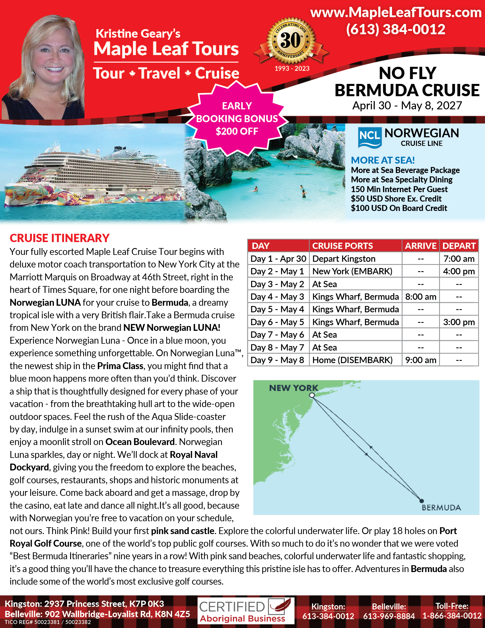 Your fully escorted Maple Leaf Cruise Tour begins with deluxe motor coach transportation to New York City at the Marriott Marquis on Broadway at 46th Street, right in the heart of Times Square, for one night before boarding the Norwegian LUNA for your cruise to Bermuda, a dreamy tropical isle with a very British flair.