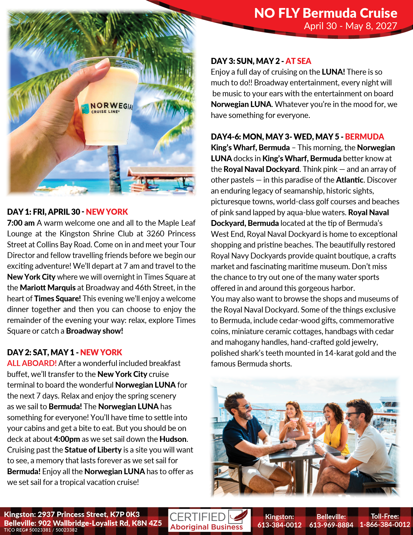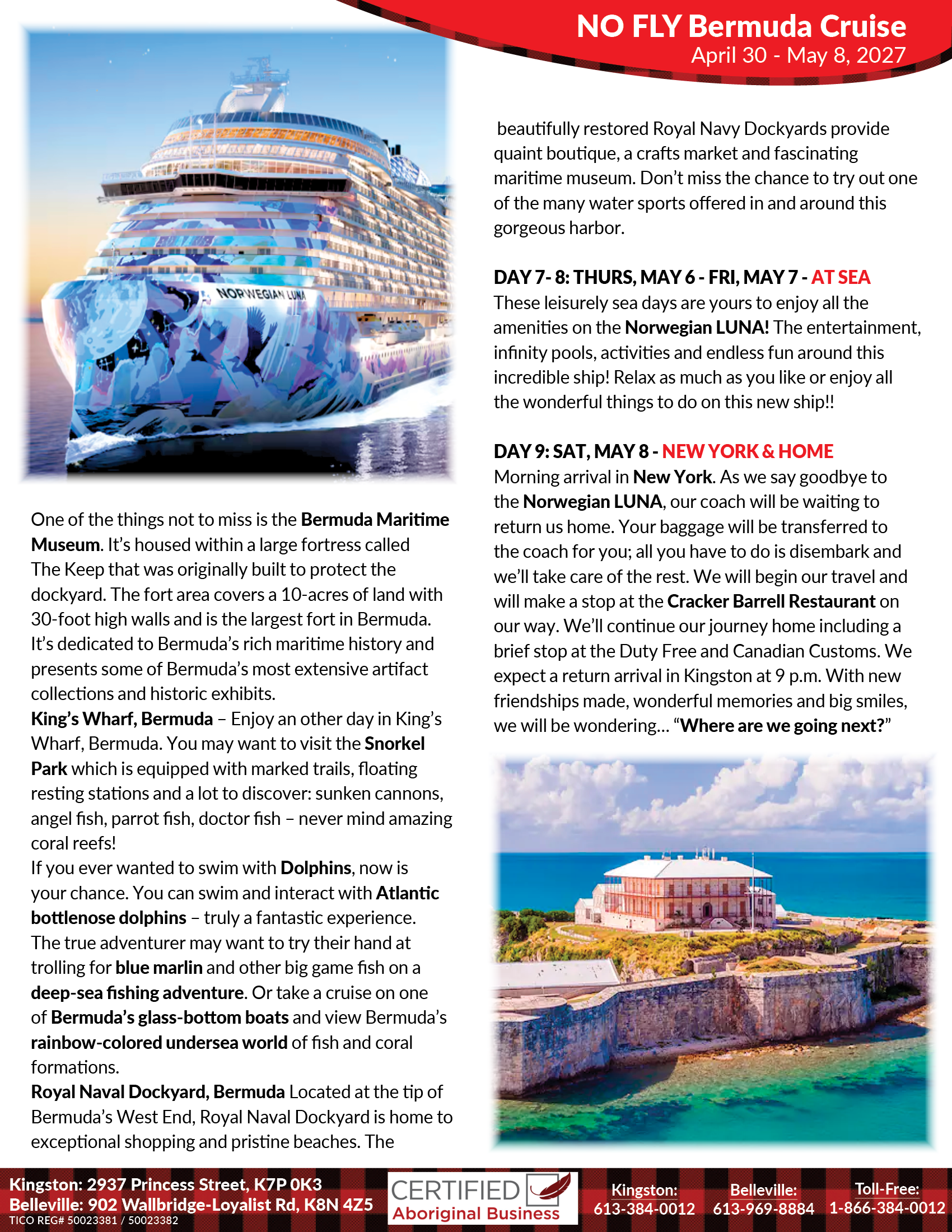 Morning arrival in New York. As we say goodbye to the Norwegian LUNA, our coach will be waiting to return us home. Your baggage will be transferred to the coach for you; all you have to do is disembark and we’ll take care of the rest. We will begin our travel and will make a stop at the Cracker Barrell Restaurant on our way. We’ll continue our journey home including a brief stop at the Duty Free and Canadian Customs. We expect a return arrival in Kingston at 9 p.m. With new friendships made, wonderful memories and big smiles, we will be wondering… “Where are we going next?”
