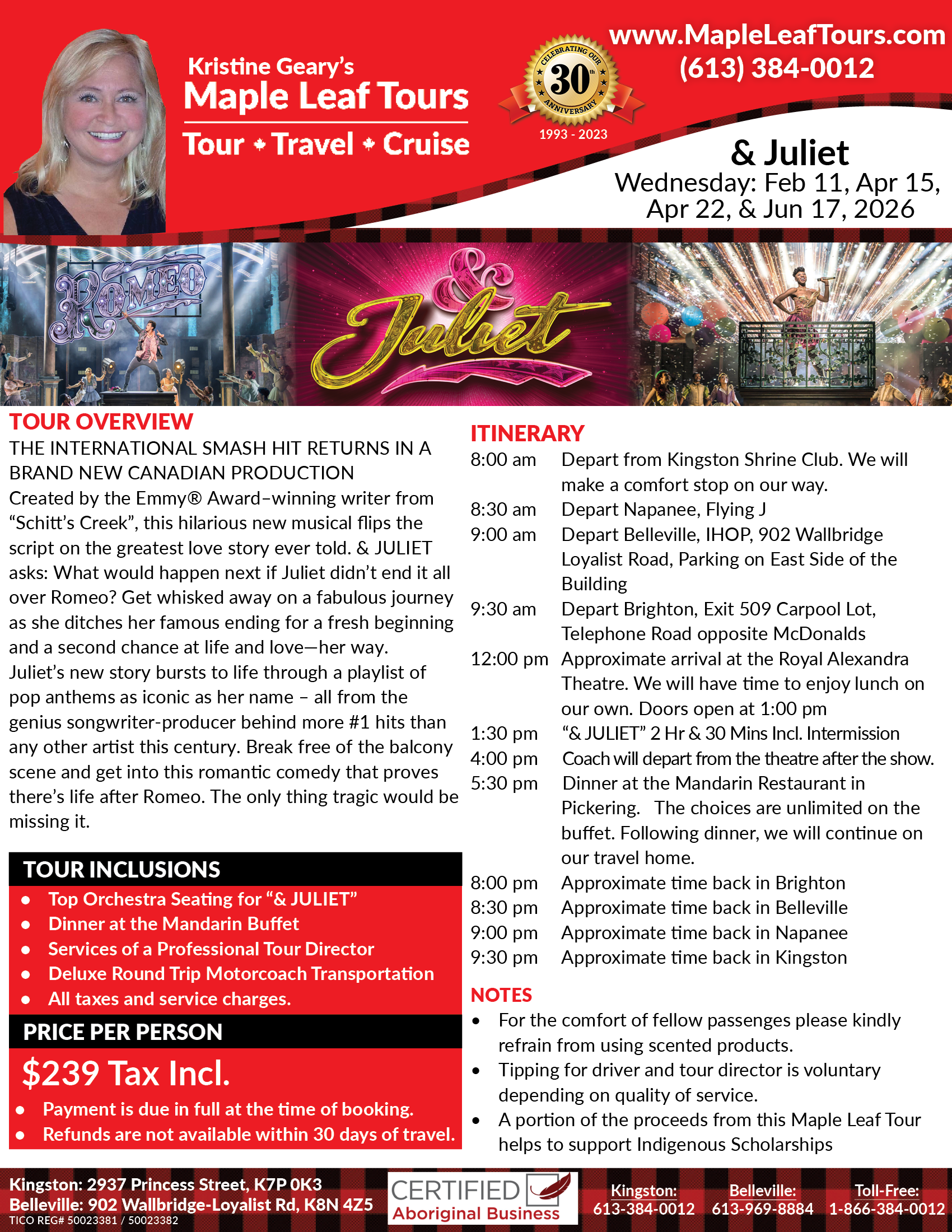 - 1:30 pm “& Juliet” 2 Hr & 30 Mins Incl. Intermission