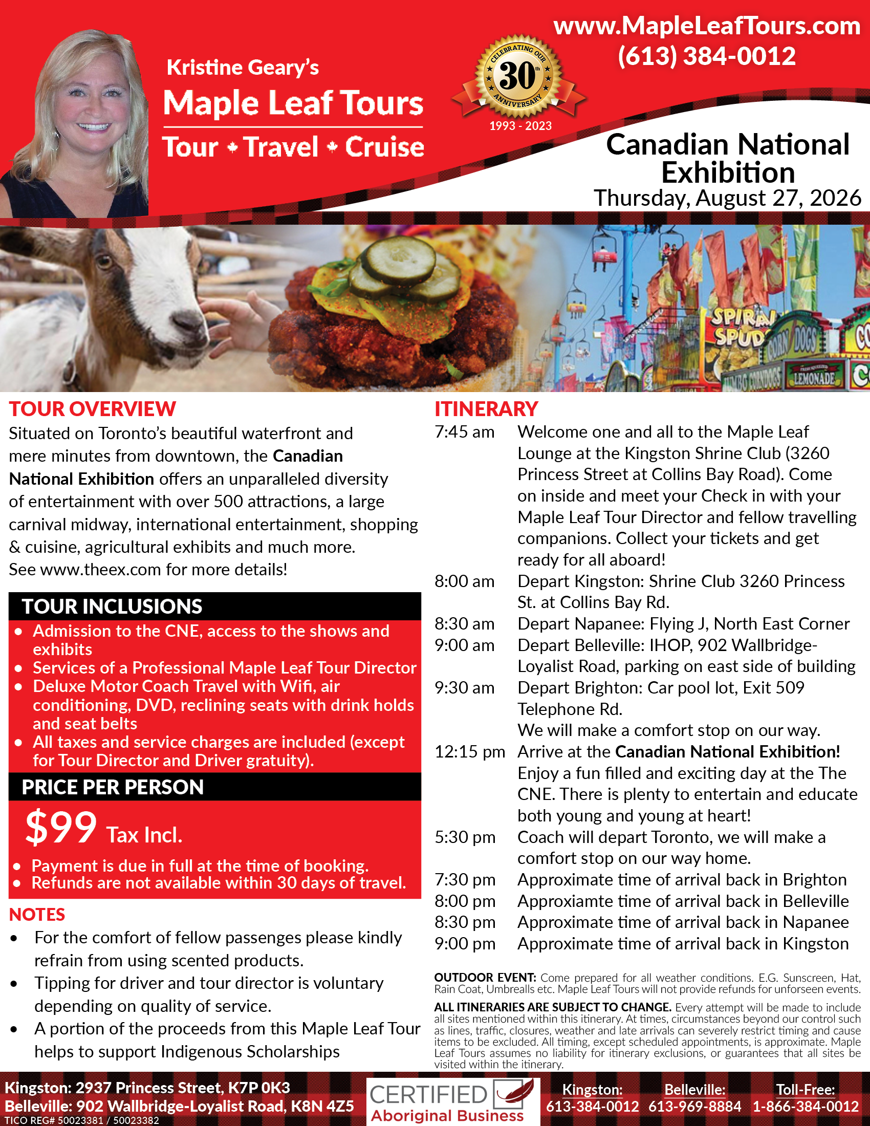 12:15 pm Arrive at the Canadian National Exhibition! Enjoy a fun filled and exciting day at the The CNE. There is plenty to entertain and educate both young and young at heart!
