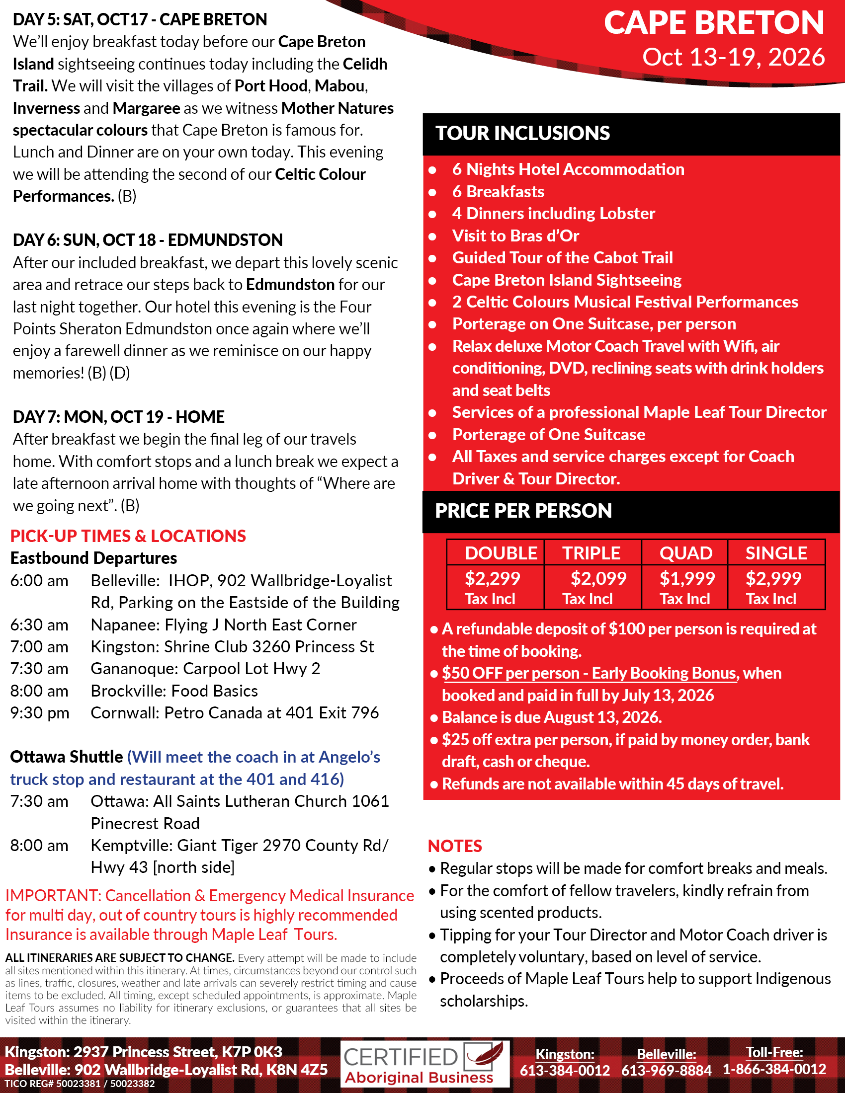 - Services of a professional Maple Leaf Tour Director