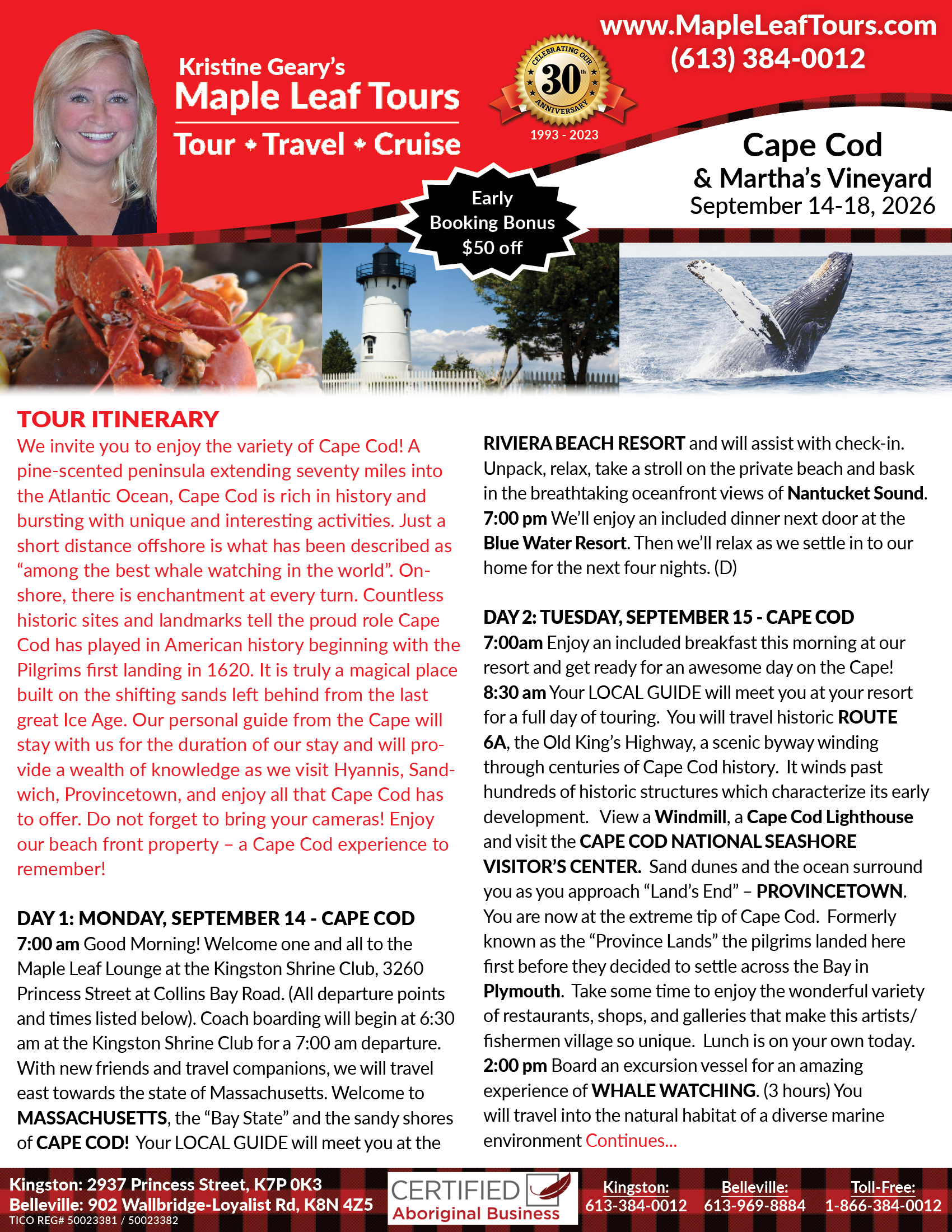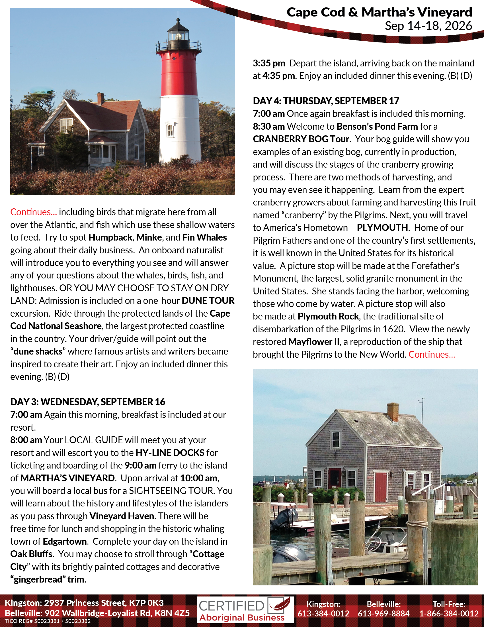 Good Morning! Welcome one and all to the Maple Leaf Lounge at the Kingston Shrine Club, 3260 Princess Street at Collins Bay Road. (All departure points and times listed below). Coach boarding will begin at 6:30 am at the Kingston Shrine Club for a 7:00 am departure. With new friends and travel companions, we will travel east towards the state of Massachusetts. Welcome to MASSACHUSETTS, the “Bay State” and the sandy shores of CAPE COD! Your LOCAL GUIDE will meet you at the RIVIERA BEACH RESORT and will assist with check-in. Unpack, relax, take a stroll on the private beach and bask in the breathtaking oceanfront views of Nantucket Sound. At 7:00 pm we’ll enjoy an included dinner next door at the Blue Water Resort. Then we’ll relax as we settle in to our home for the next four nights. (D)