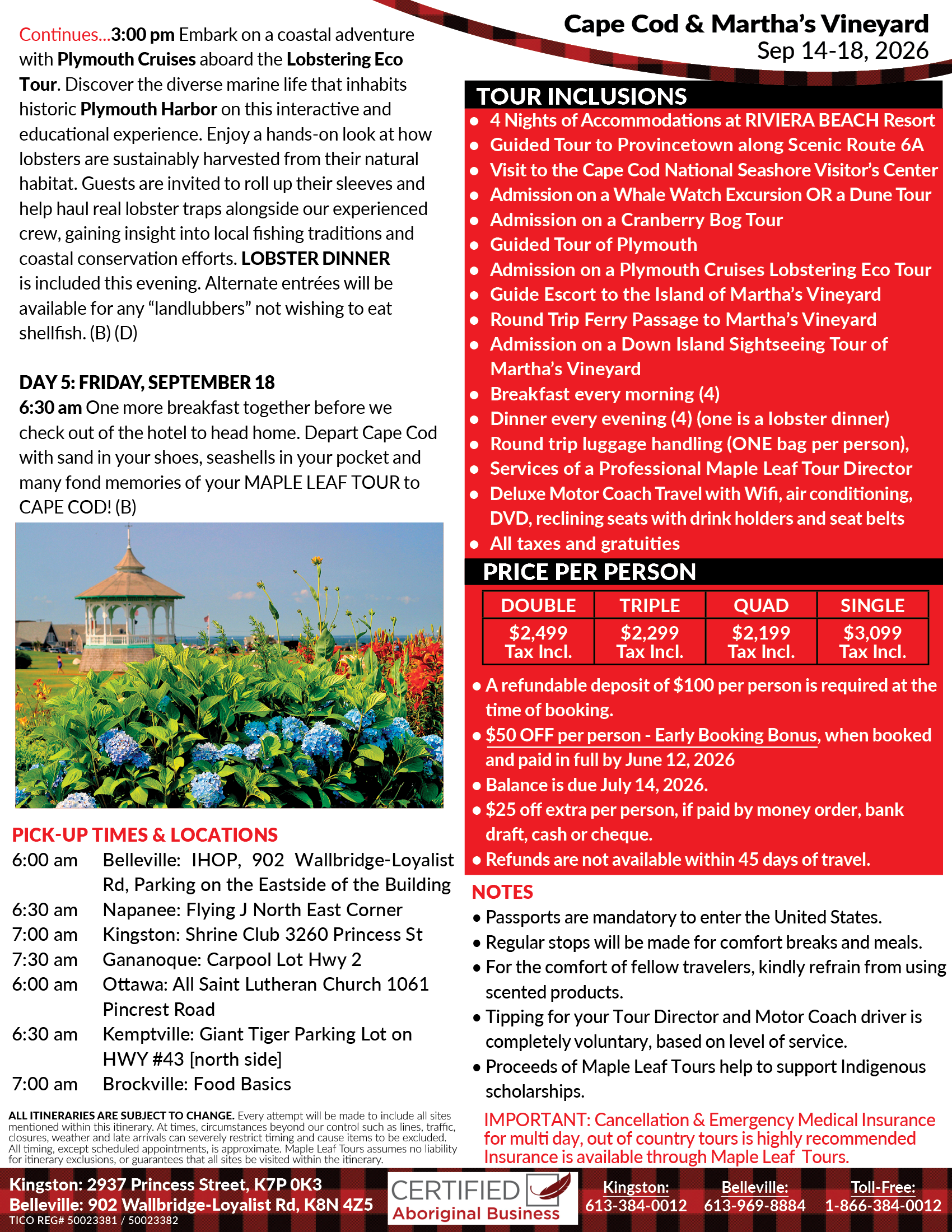 6:30 am One more breakfast together before we check out of the hotel to head home. Depart Cape Cod with sand in your shoes, seashells in your pocket and many fond memories of your MAPLE LEAF TOUR to CAPE COD! (B)