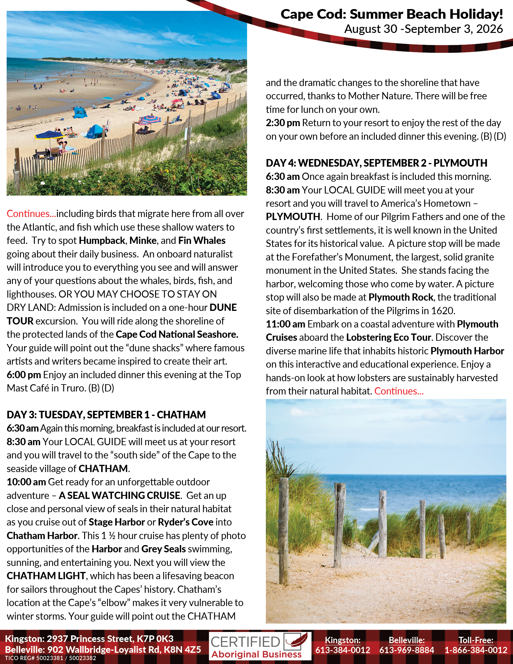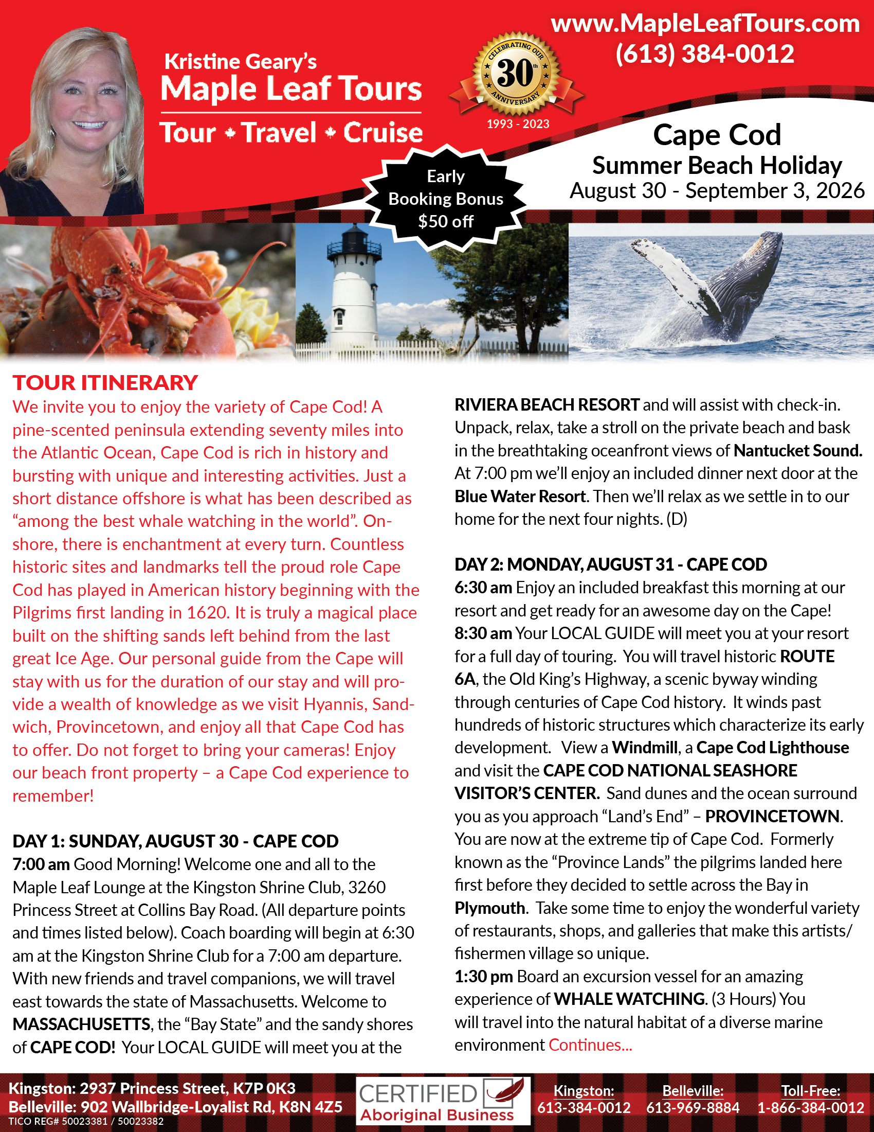 Good Morning! Welcome one and all to the Maple Leaf Lounge at the Kingston Shrine Club, 3260 Princess Street at Collins Bay Road. (All departure points and times listed below). Coach boarding will begin at 6:30 am at the Kingston Shrine Club for a 7:00 am departure. With new friends and travel companions, we will travel east towards the state of Massachusetts. Welcome to MASSACHUSETTS, the “Bay State” and the sandy shores of CAPE COD! Your LOCAL GUIDE will meet you at the RIVIERA BEACH RESORT and will assist with check-in. Unpack, relax, take a stroll on the private beach and bask in the breathtaking oceanfront views of Nantucket Sound. At 7:00 pm we’ll enjoy an included dinner next door at the Blue Water Resort. Then we’ll relax as we settle in to our home for the next four nights. (D)
