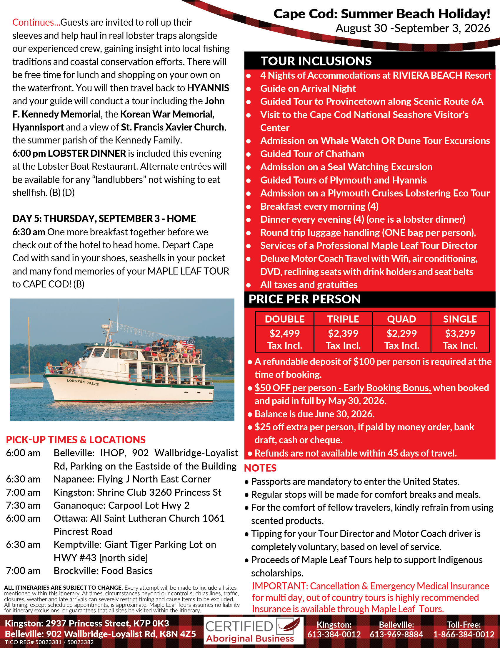 6:30 am One more breakfast together before we check out of the hotel to head home. Depart Cape Cod with sand in your shoes, seashells in your pocket and many fond memories of your MAPLE LEAF TOUR to CAPE COD! (B)