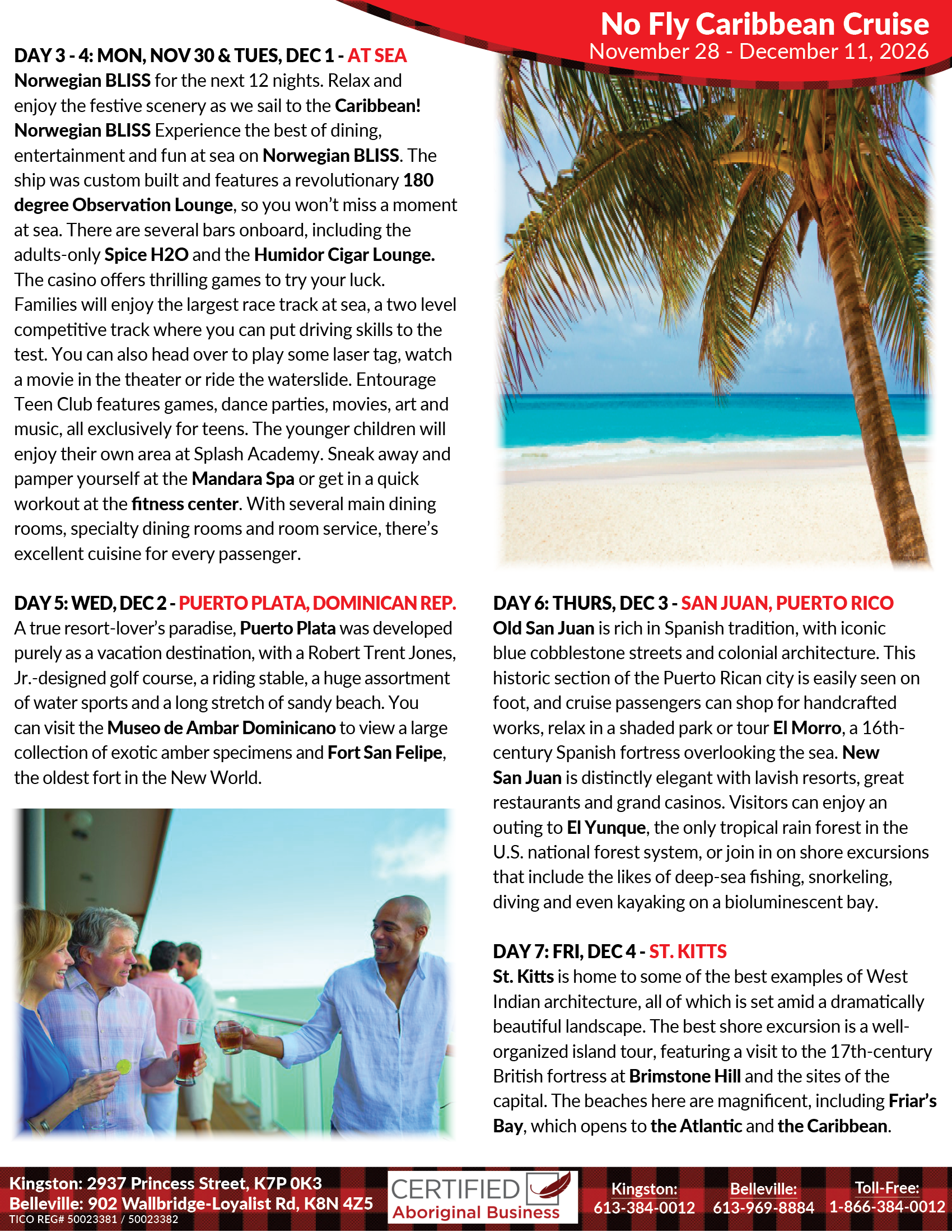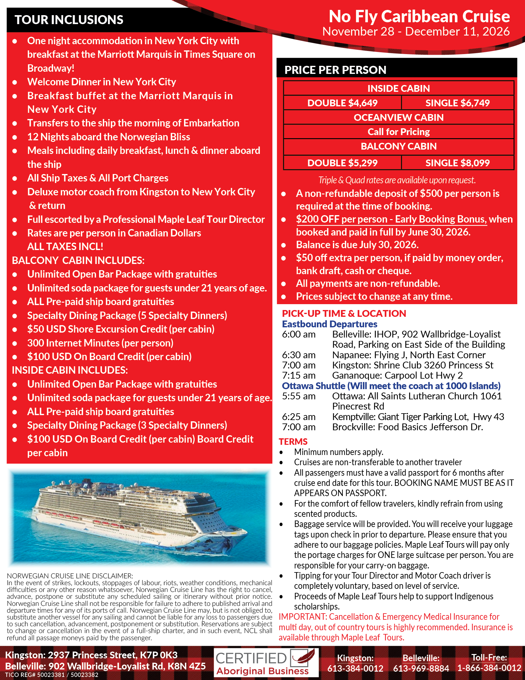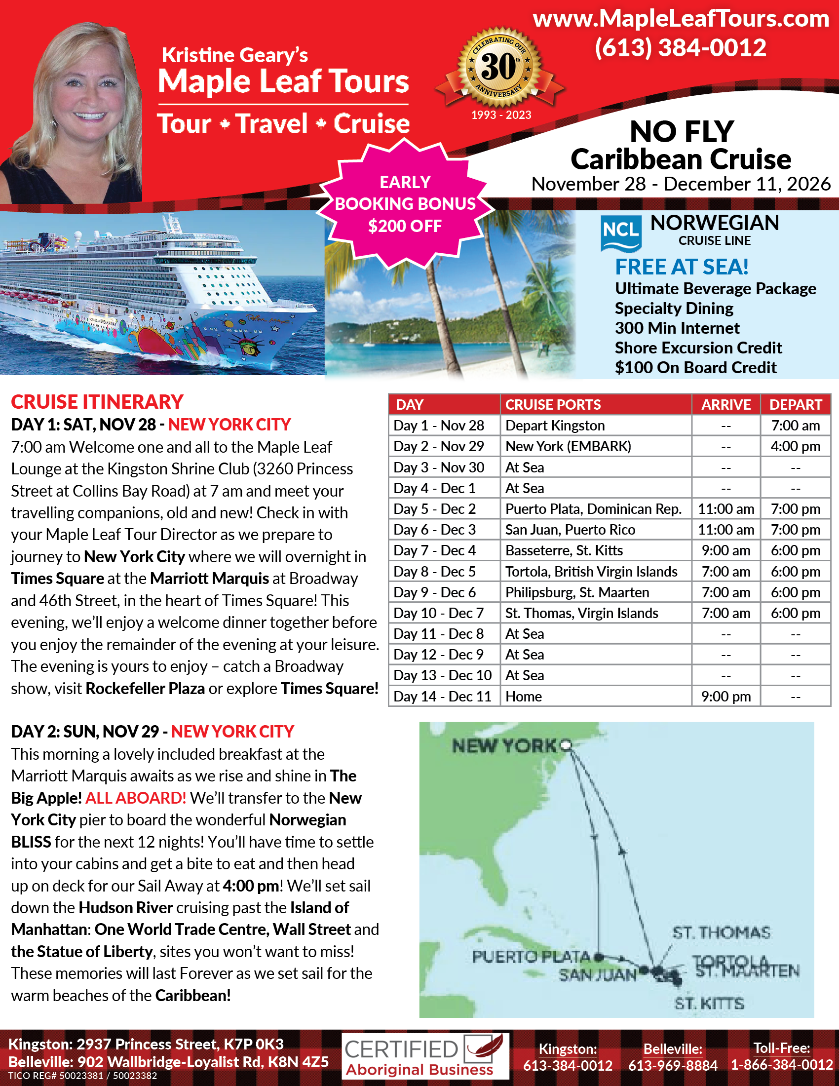 Your fully escorted Maple Leaf NO FLY Cruise Tour begins with deluxe motor coach transportation to New York City with a pre-stay at the Marriott Marquis on Broadway at 46th Street, right in the heart of Times Square. We’ll enjoy a lovely welcome dinner together and full breakfast buffet at our hotel the following morning before boarding the Norwegian Bliss for your winter cruise to the warm breezes and soft sand of the Caribbean.