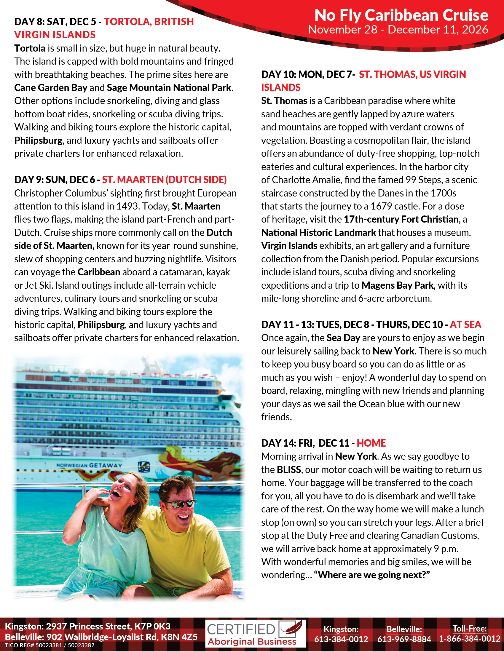 Morning arrival in New York. As we say goodbye to the BLISS, our motor coach will be waiting to return us home. Your baggage will be transferred to the coach for you, all you have to do is disembark and we’ll take care of the rest. On the way home we will make a lunch stop (on own) so you can stretch your legs. After a brief stop at the Duty Free and clearing Canadian Customs, we will arrive back home at approximately 9 p.m. With wonderful memories and big smiles, we will be wondering… “Where are we going next?”