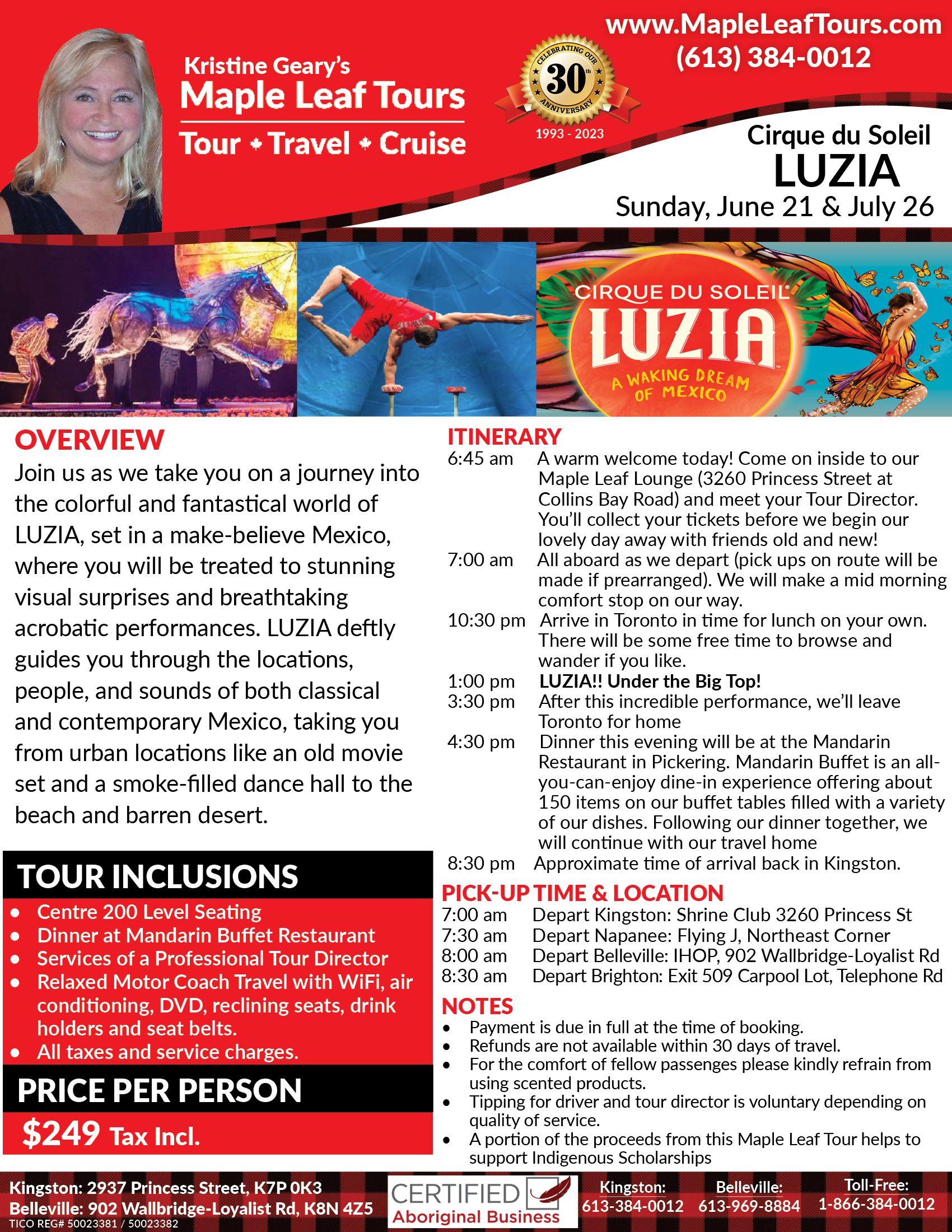 7:45 am A warm welcome today! Come on inside to our Maple Leaf Lounge (3260 Princess Street at Collins Bay Road) and meet your Tour Director. You’ll collect your tickets before we begin our lovely day away with friends old and new!