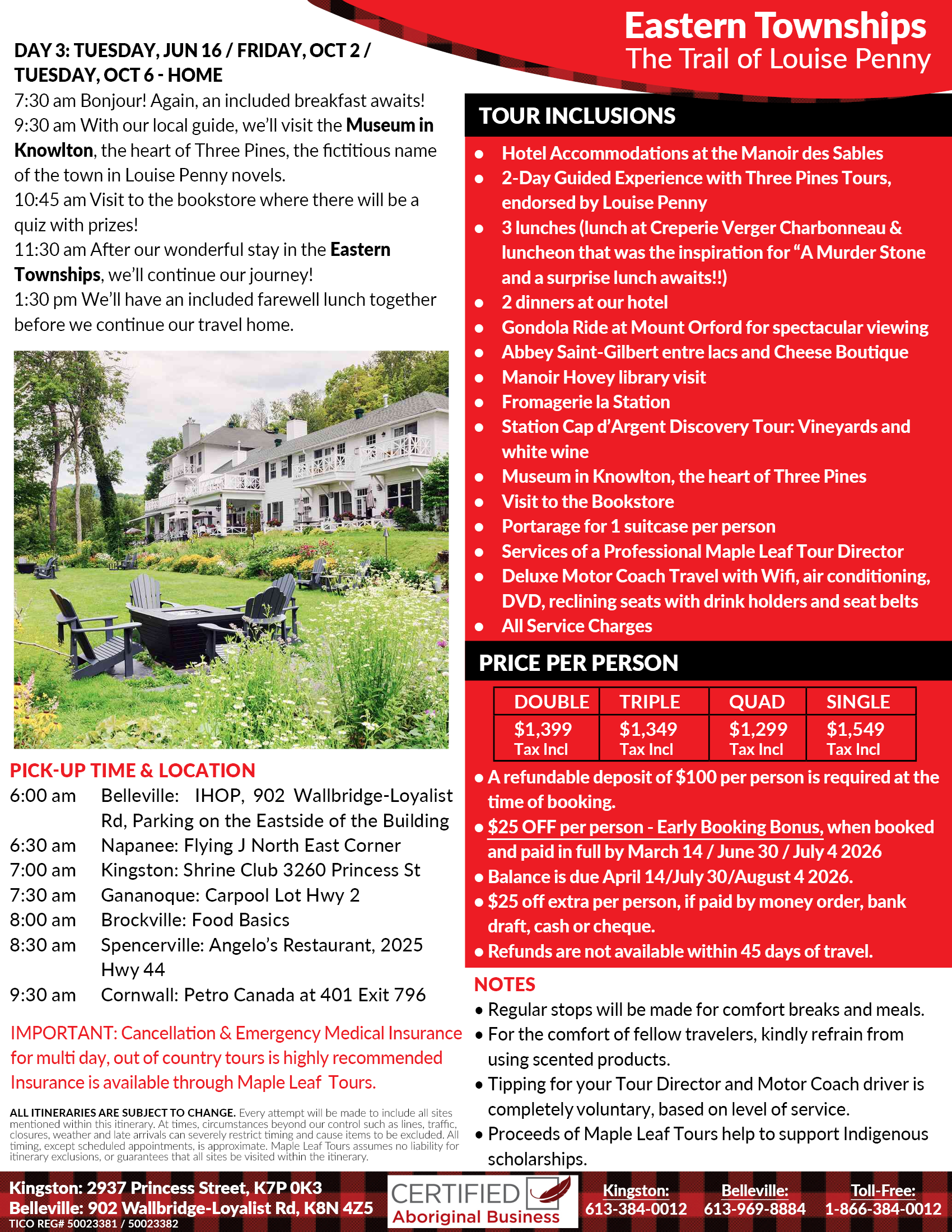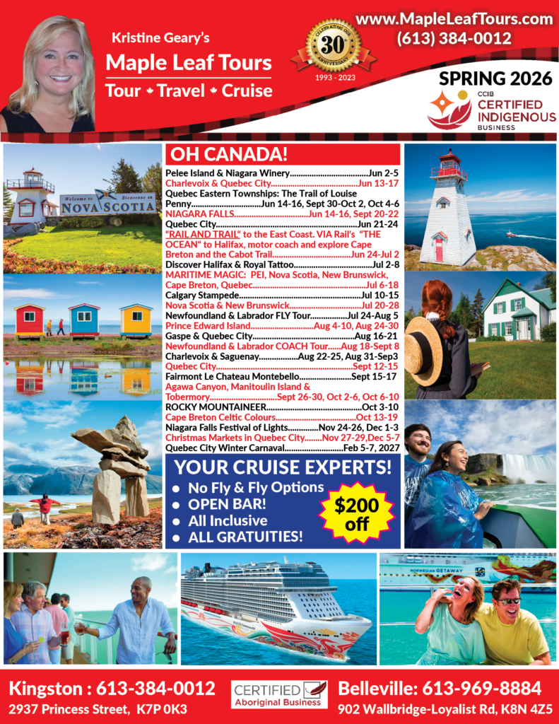 • 8:00 am Welcome one and all to the Maple Leaf Lounge at the Kingston Shrine Club, 3260 Princess Street at Collins Bay Road, as we meet our fellow travelling companions and prepare for our exciting adventure together to the Eastern Townships of Quebec for this spectacular tour! We will depart from Kingston and we’ll pick up our travelling companions along the way.