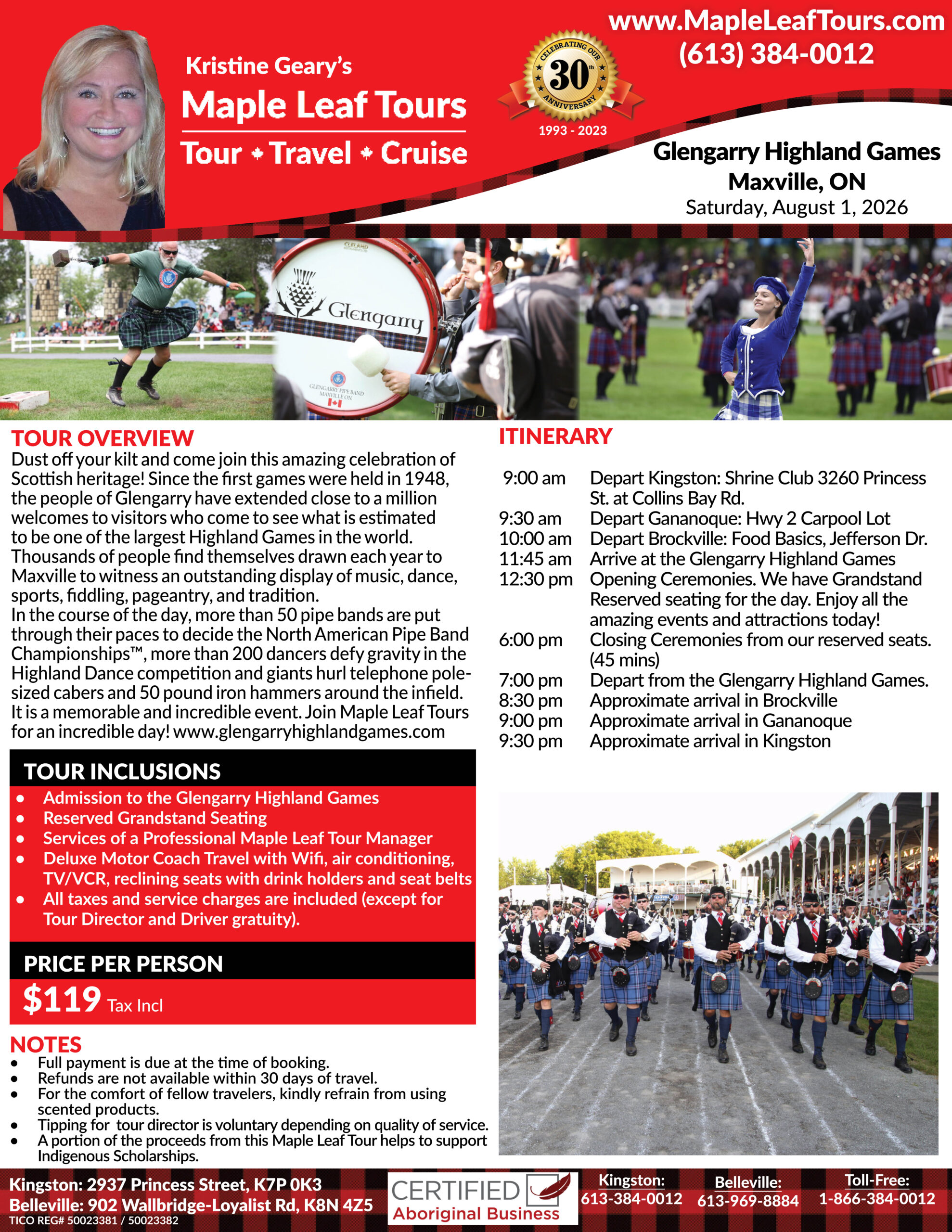 In the course of the day, more than 50 pipe bands are put through their paces to decide the North American Pipe Band Championships™, more than 200 dancers defy gravity in the Highland Dance competition and giants hurl telephone pole-sized cabers and 50 pound iron hammers around the infield. It is a memorable and incredible event. Join Maple Leaf Tours for an incredible day! www.glengarryhighlandgames.com