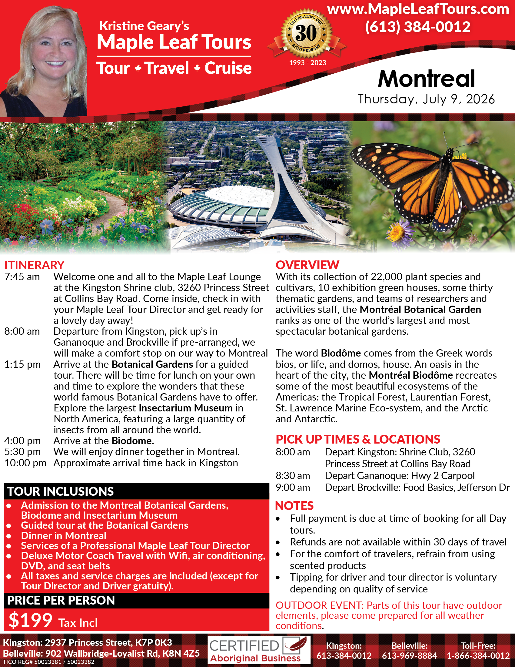 - 8:00 am Departure from Kingston, pick up’s in Gananoque and Brockville if pre-arranged, we will make a mid-morning comfort stop on our way to Montreal