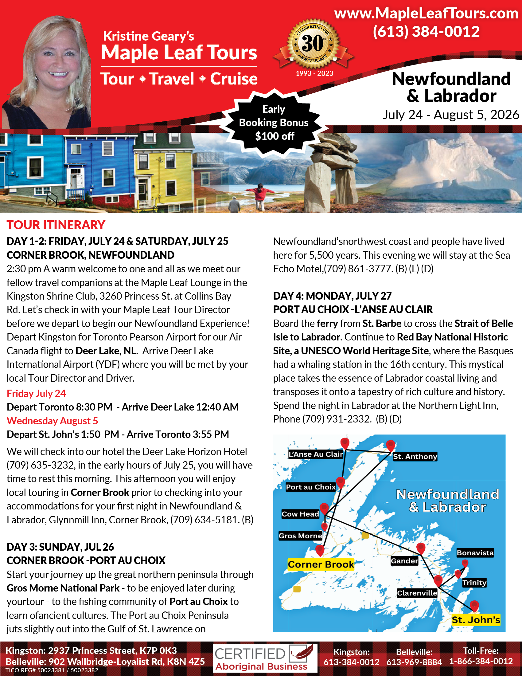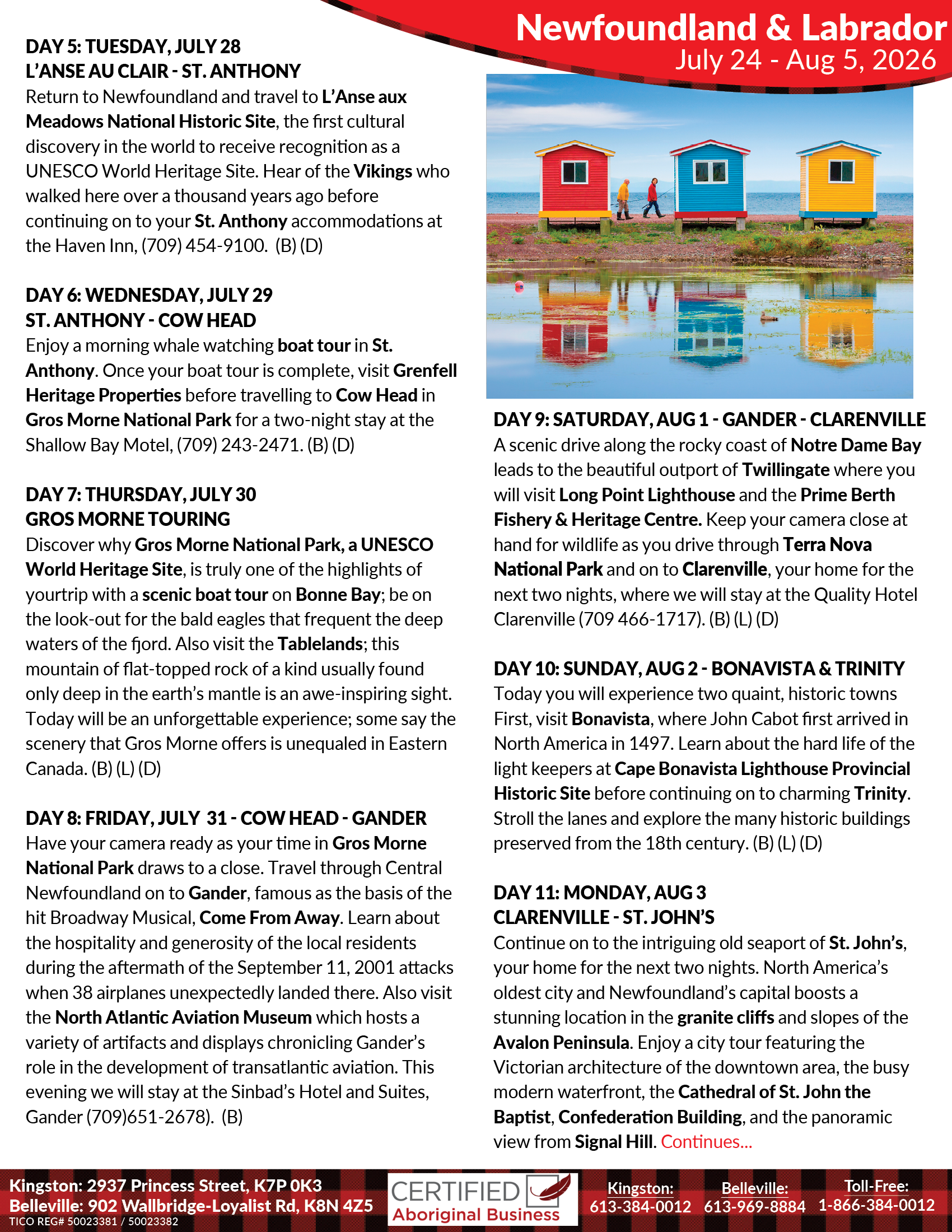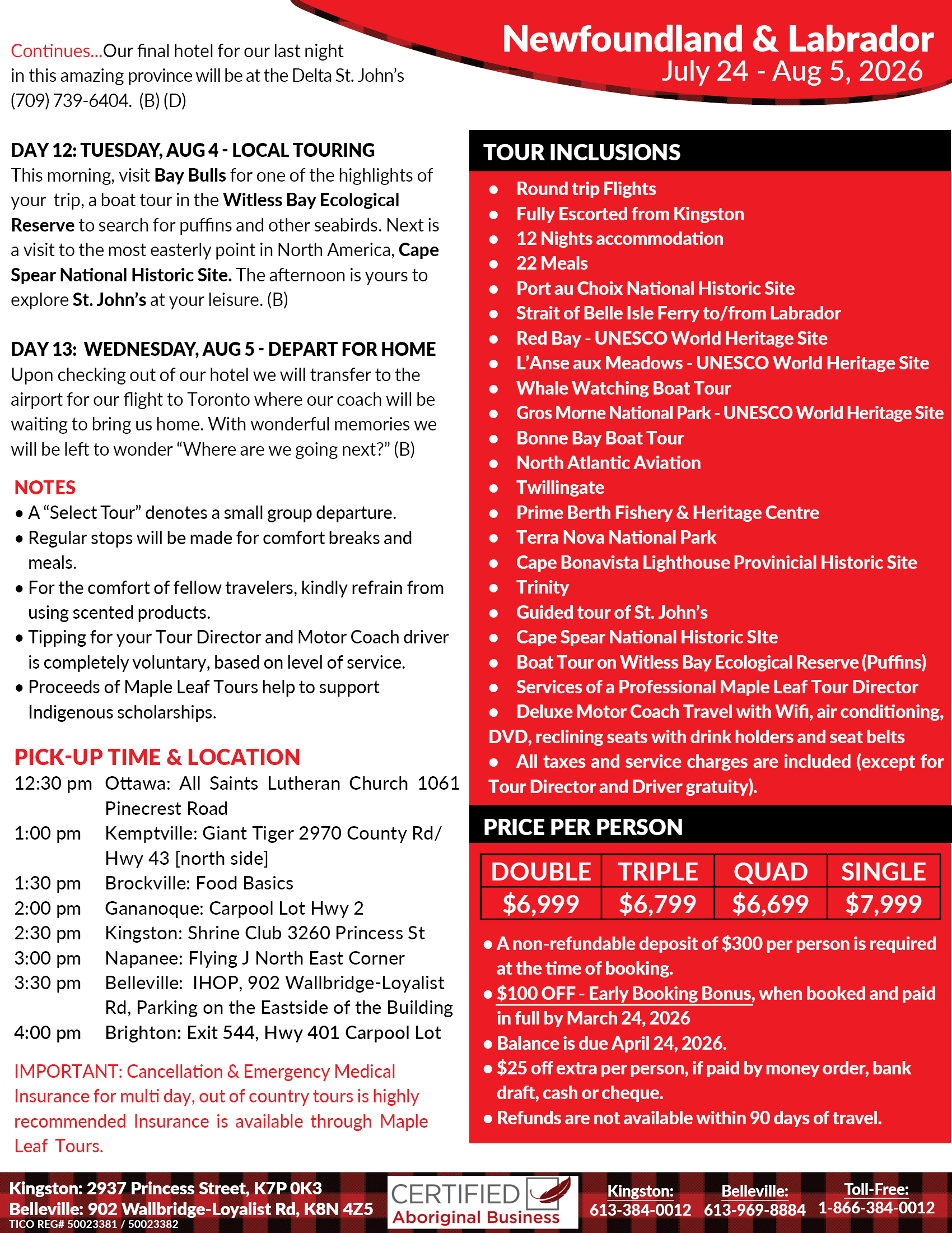 Depart Kingston for our Toronto Pearson Airport for our Air Canada flight to Deer Lake, NL. (See other pick up locations on back)