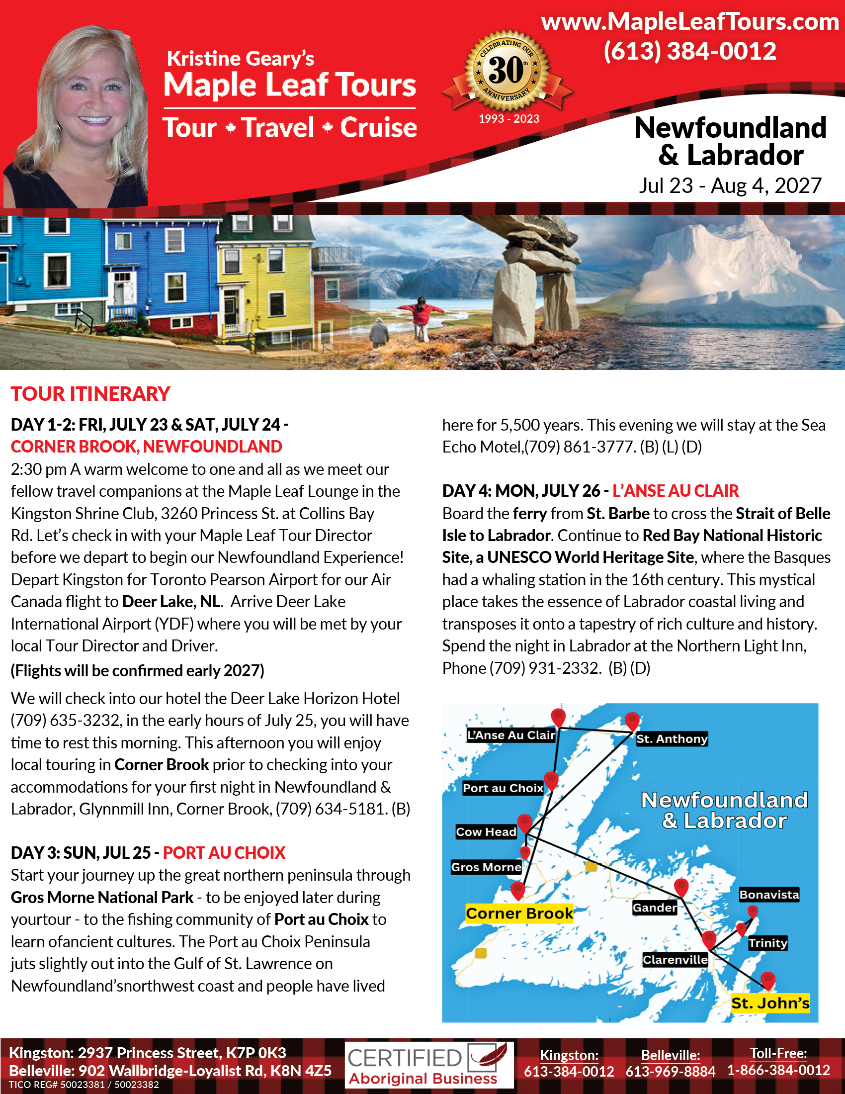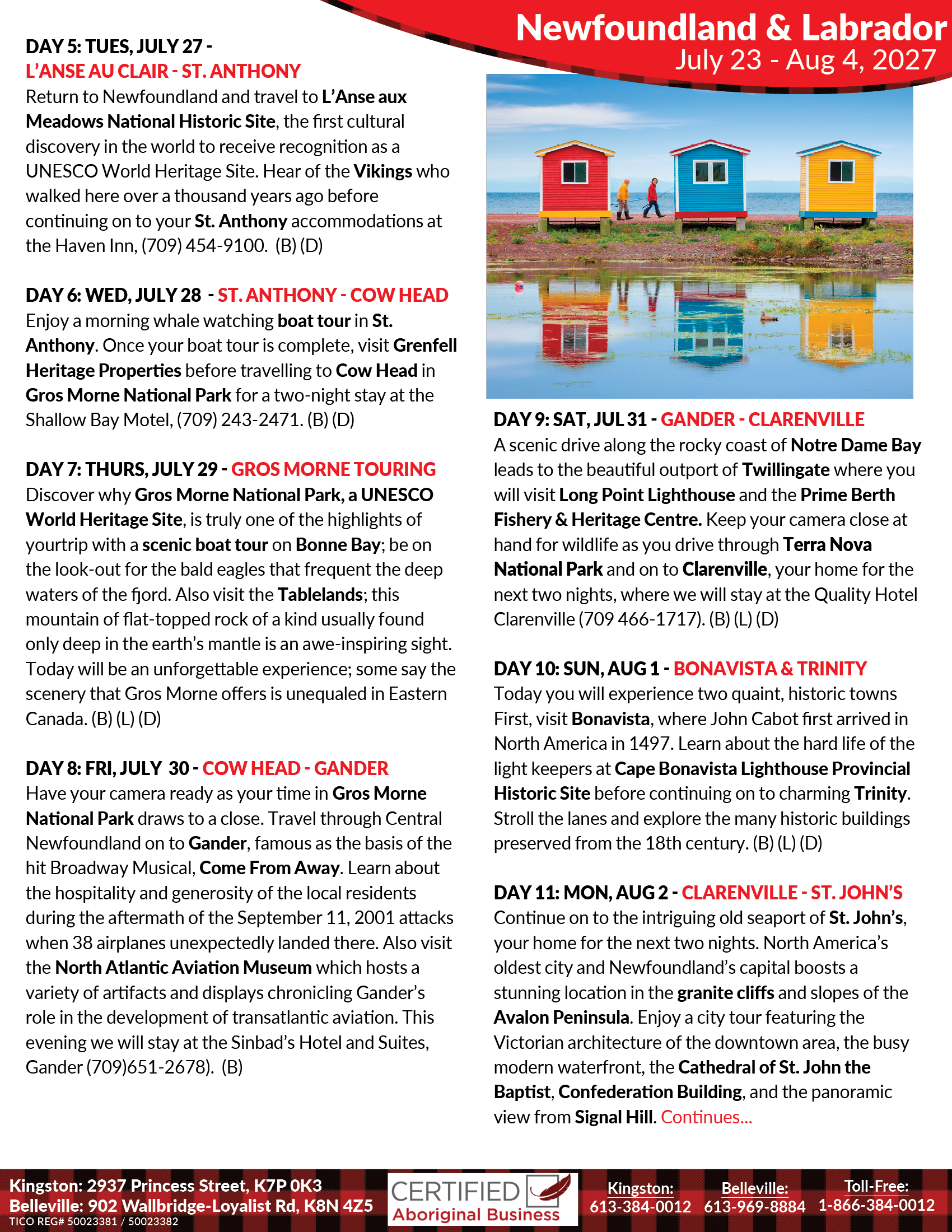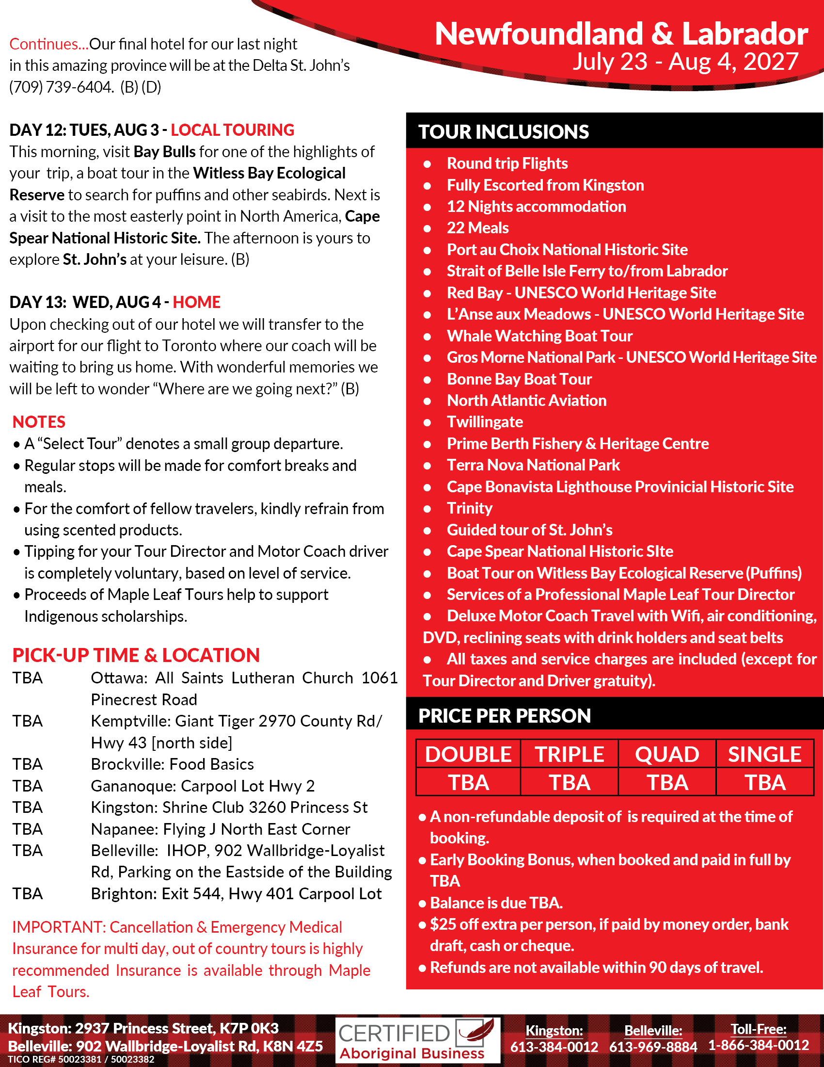 Depart Kingston for our Toronto Pearson Airport for our Air Canada flight to Deer Lake, NL. (See other pick up locations on back)