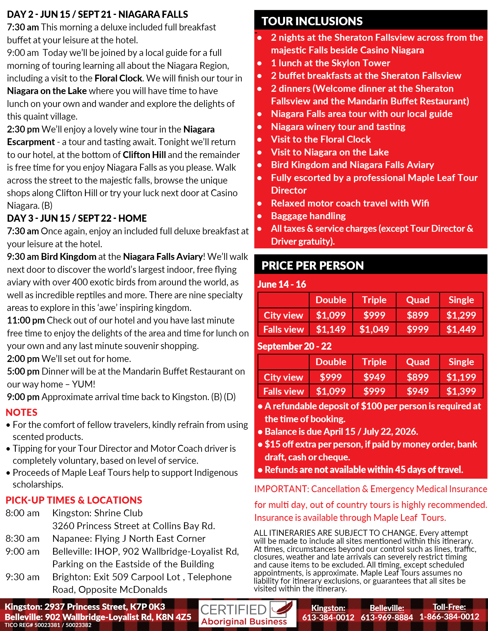 8:00 am Good Morning and welcome one and all to the Maple Leaf Lounge at the Kingston Shrine Club, 3260 Princess Street at Collins Bay Road. (All departure points