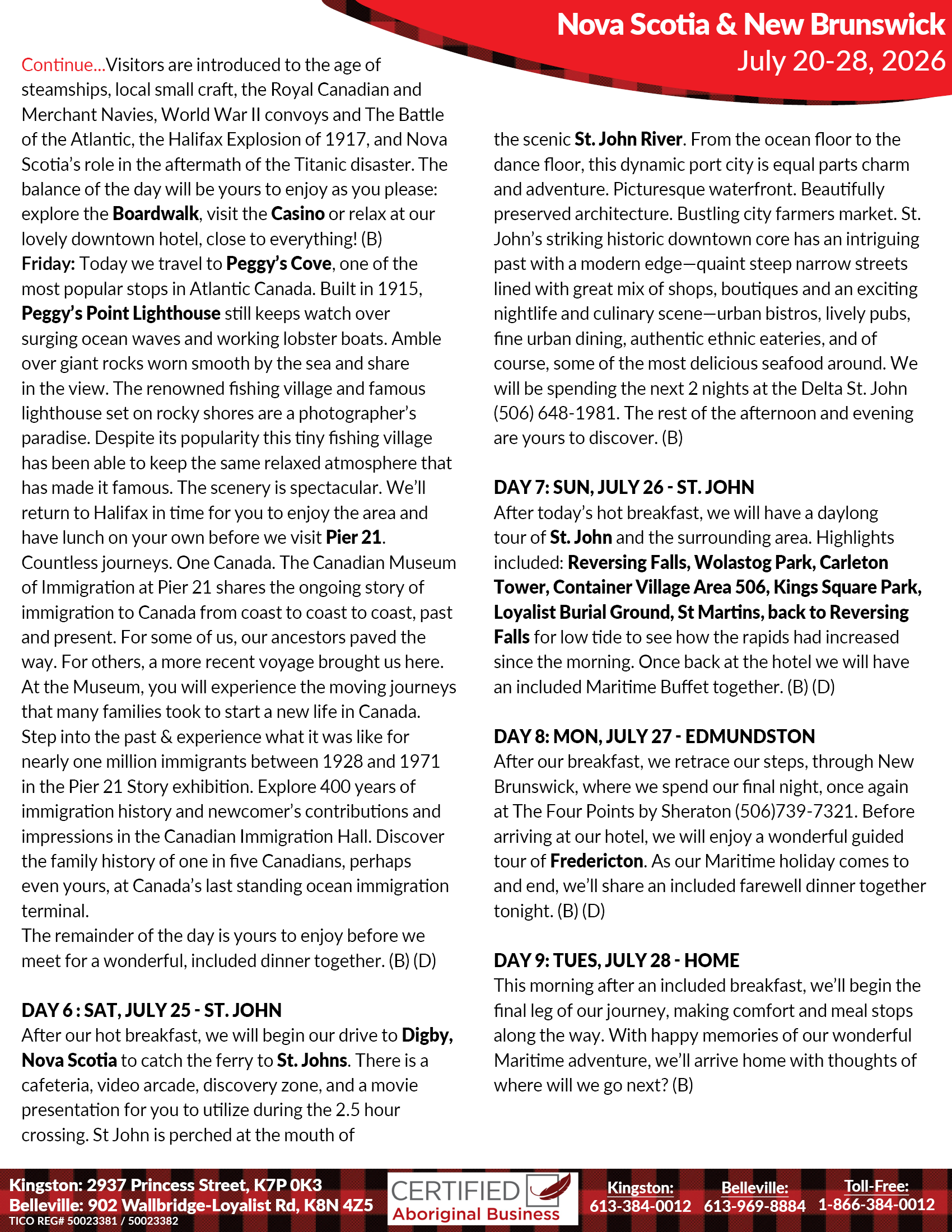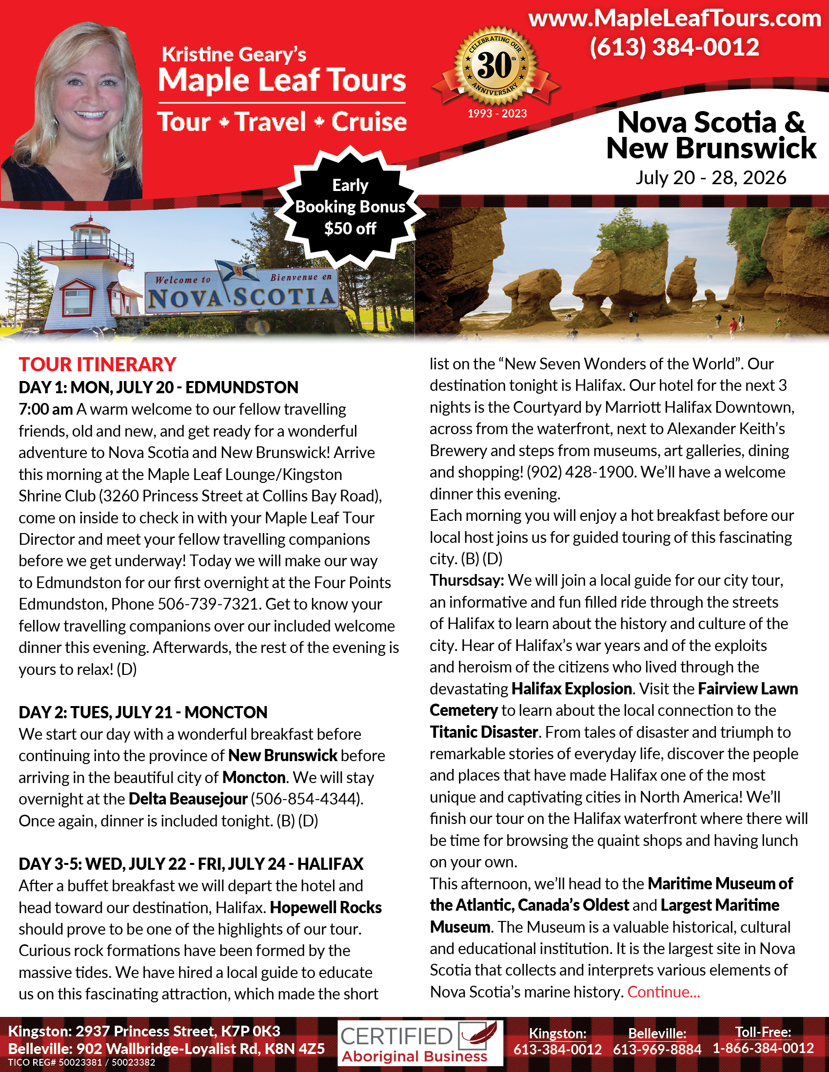 8:00 am A warm welcome to our fellow travelling friends, old and new, and get ready for a wonderful adventure to Nova Scotia and New Brunswick! Arrive this morning at the Maple Leaf Lounge/Kingston Shrine Club (3260 Princess Street at Collins Bay Road), come on inside to check in with your Maple Leaf Tour Director and meet your fellow travelling companions before we get underway! Today we will make our way to Edmundston for our first overnight at the Four Points Edmundston, Phone 506-739-7321. Get to know your fellow travelling companions over our included welcome dinner this evening. Afterwards, the rest of the evening is yours to relax! (D)