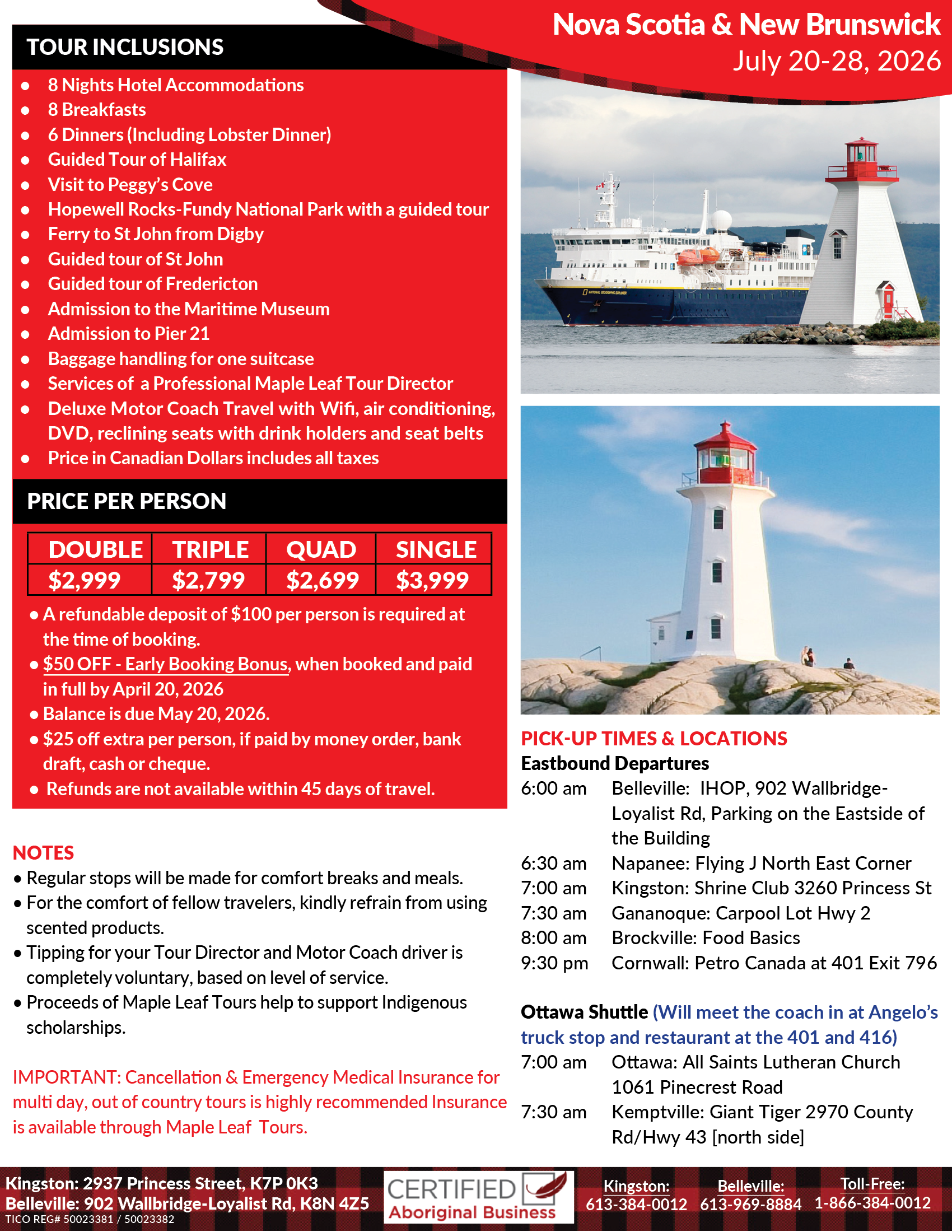- A portion of the proceeds from this Maple Leaf Tour helps to support Indigenous Scholarships