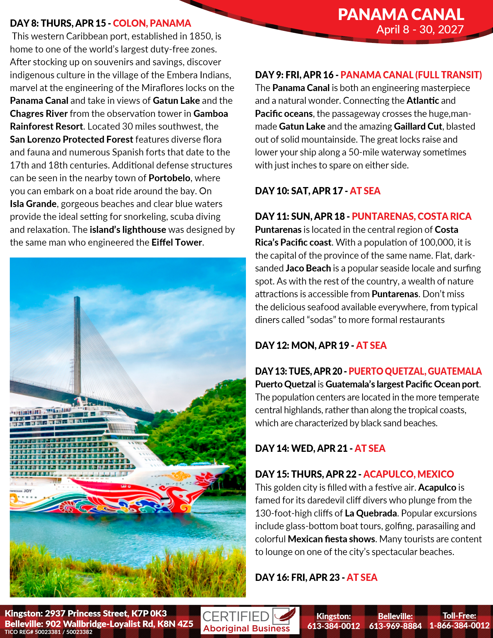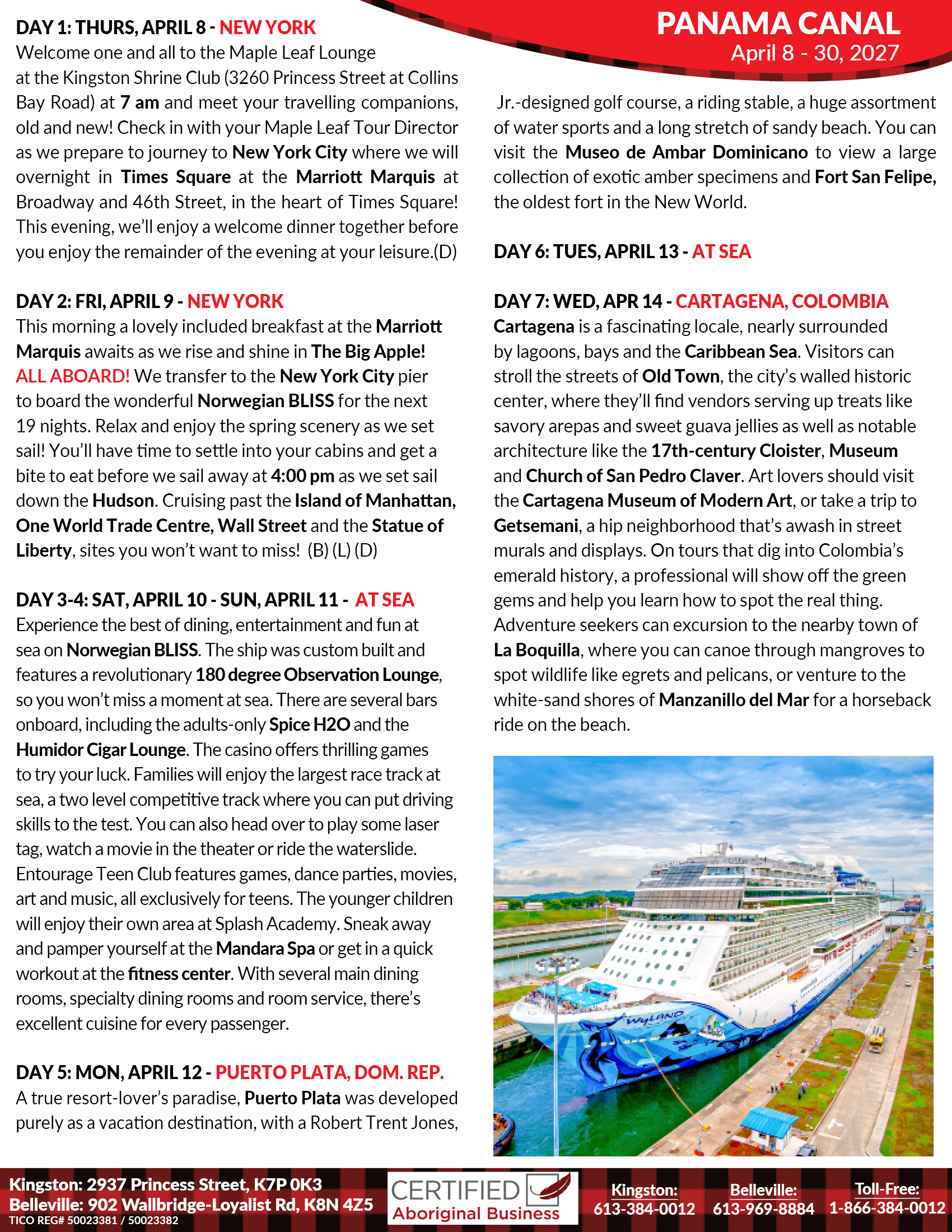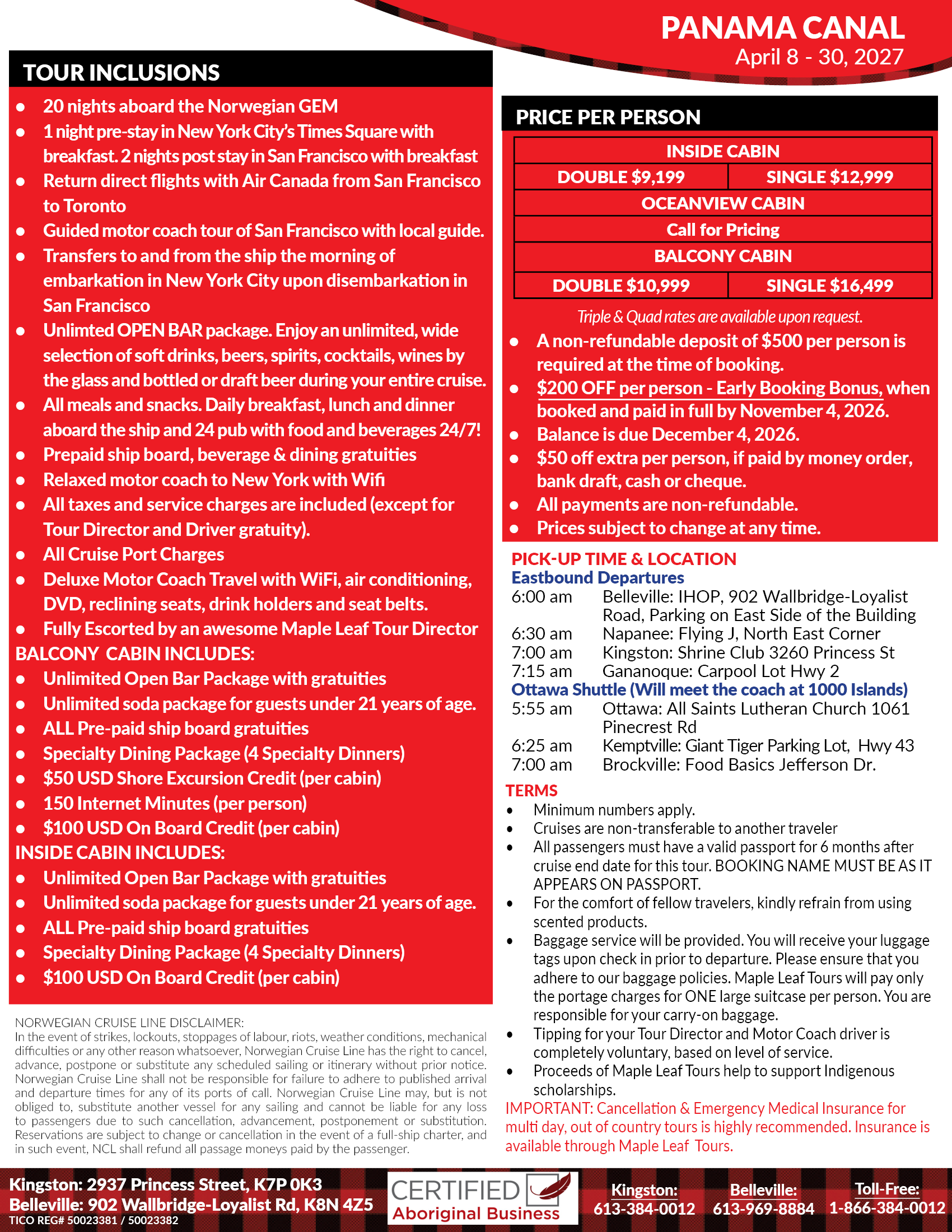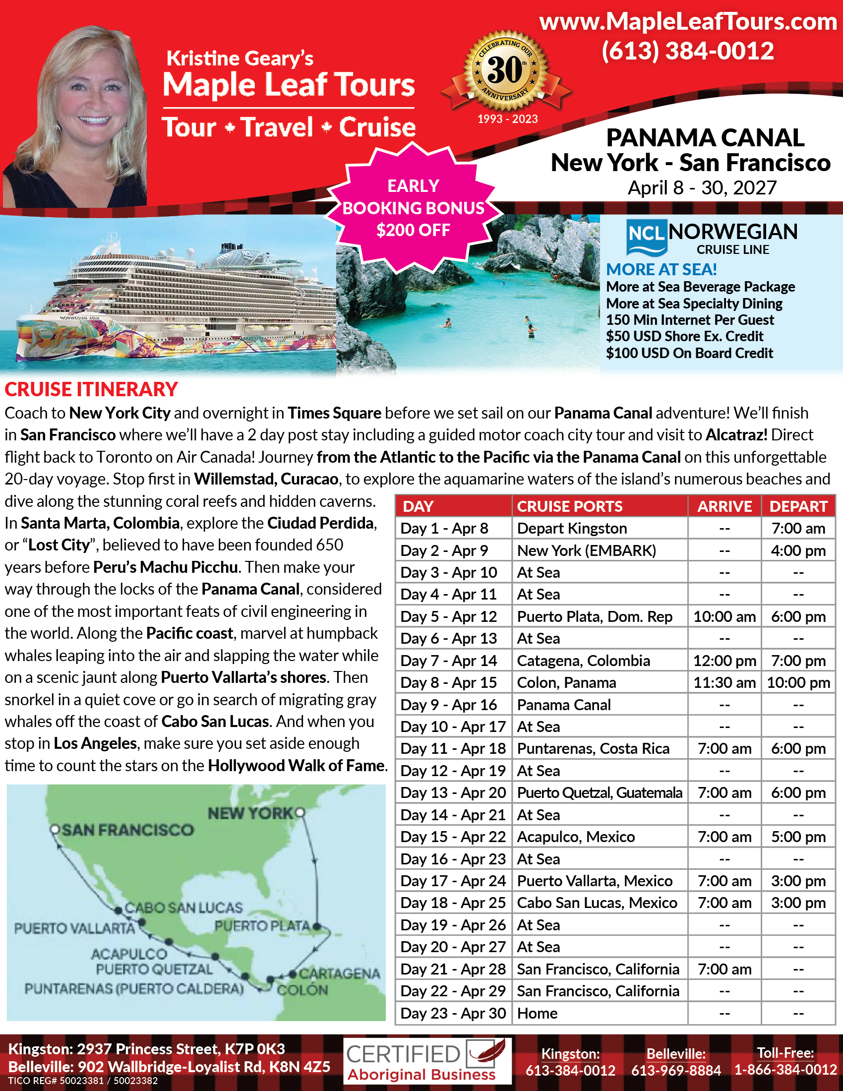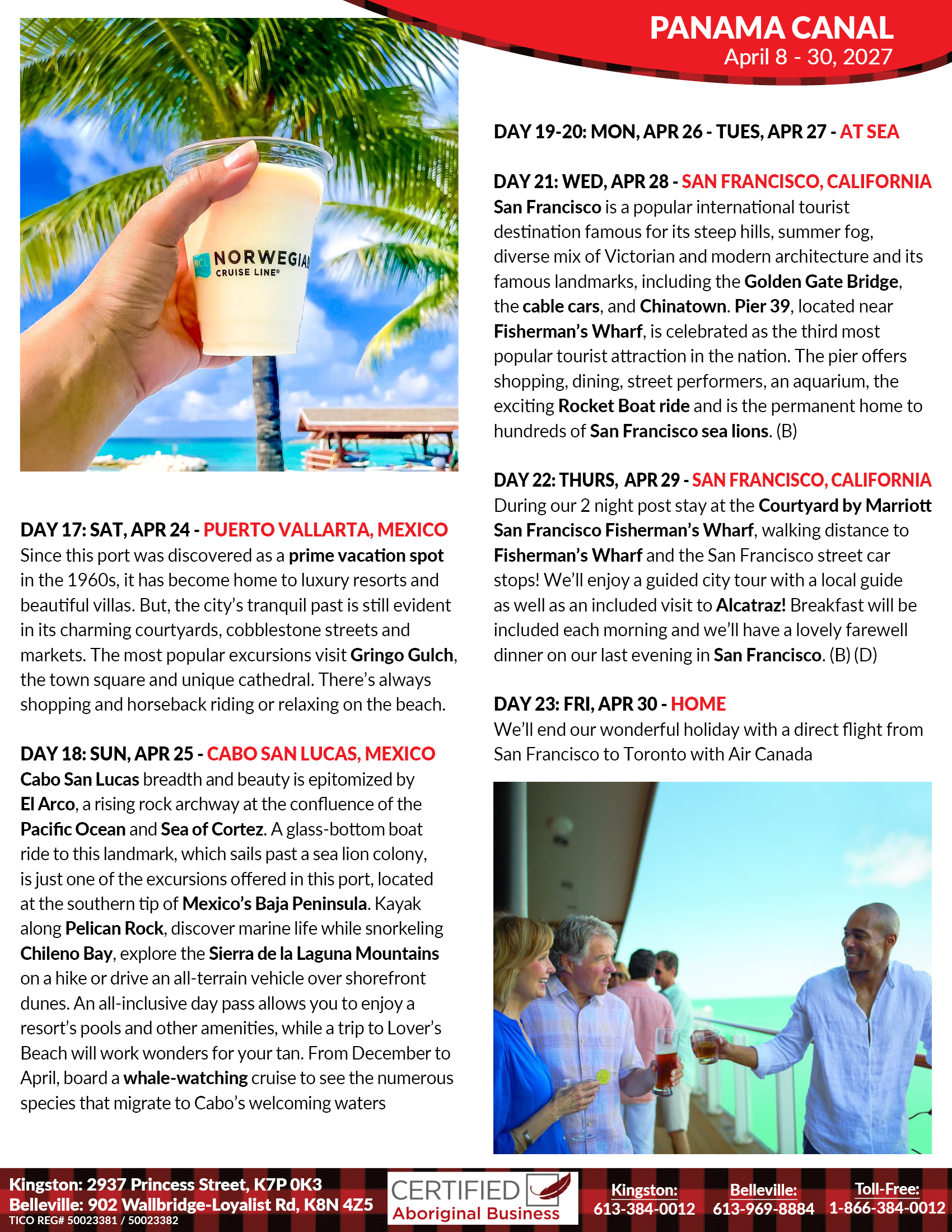 Coach to New York City and overnight in Times Square before we set sail on our Panama Canal adventure! We’ll finish in San Francisco where we’ll have a 2 day post stay including a guided motor coach city tour and visit to Alcatraz! Direct flight back to Toronto on Air Canada!