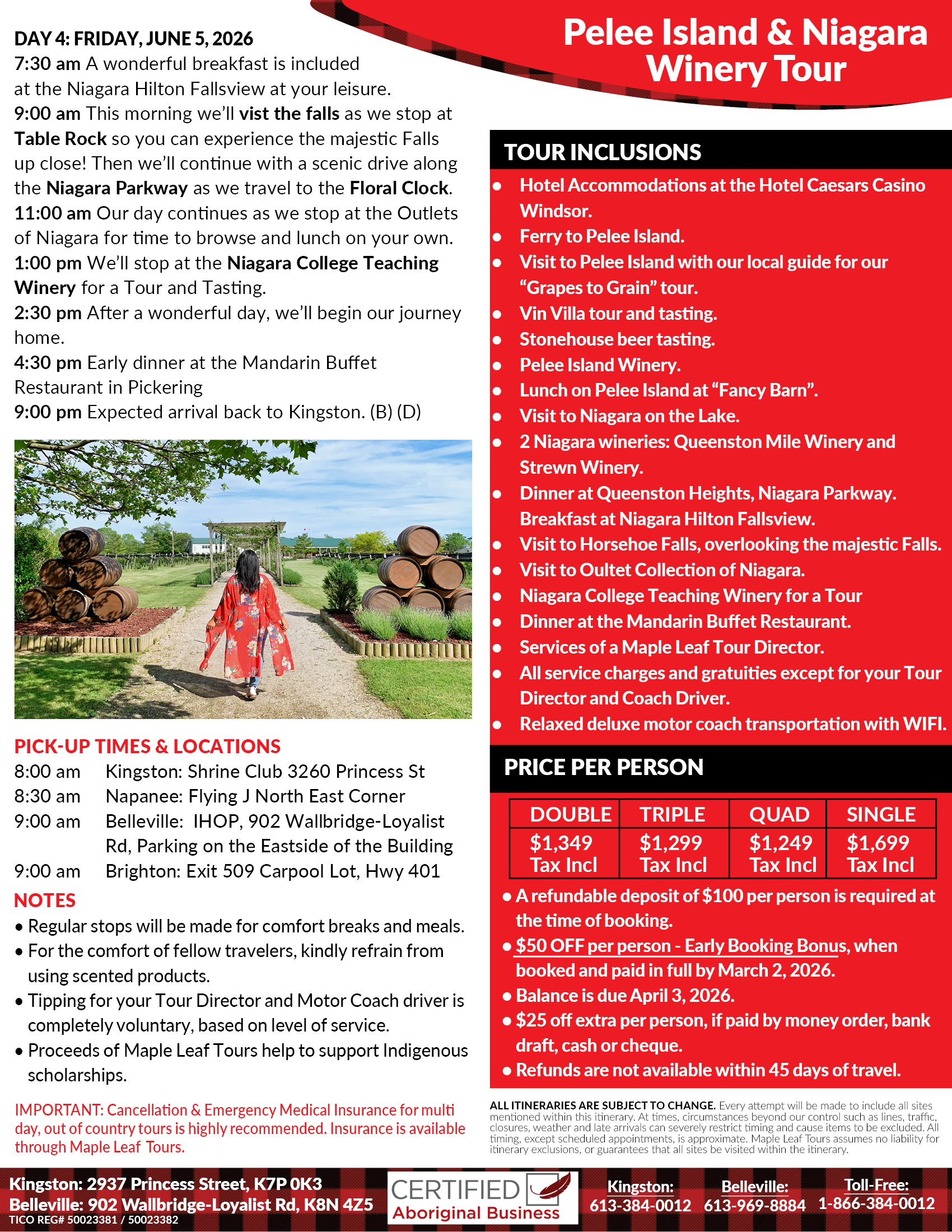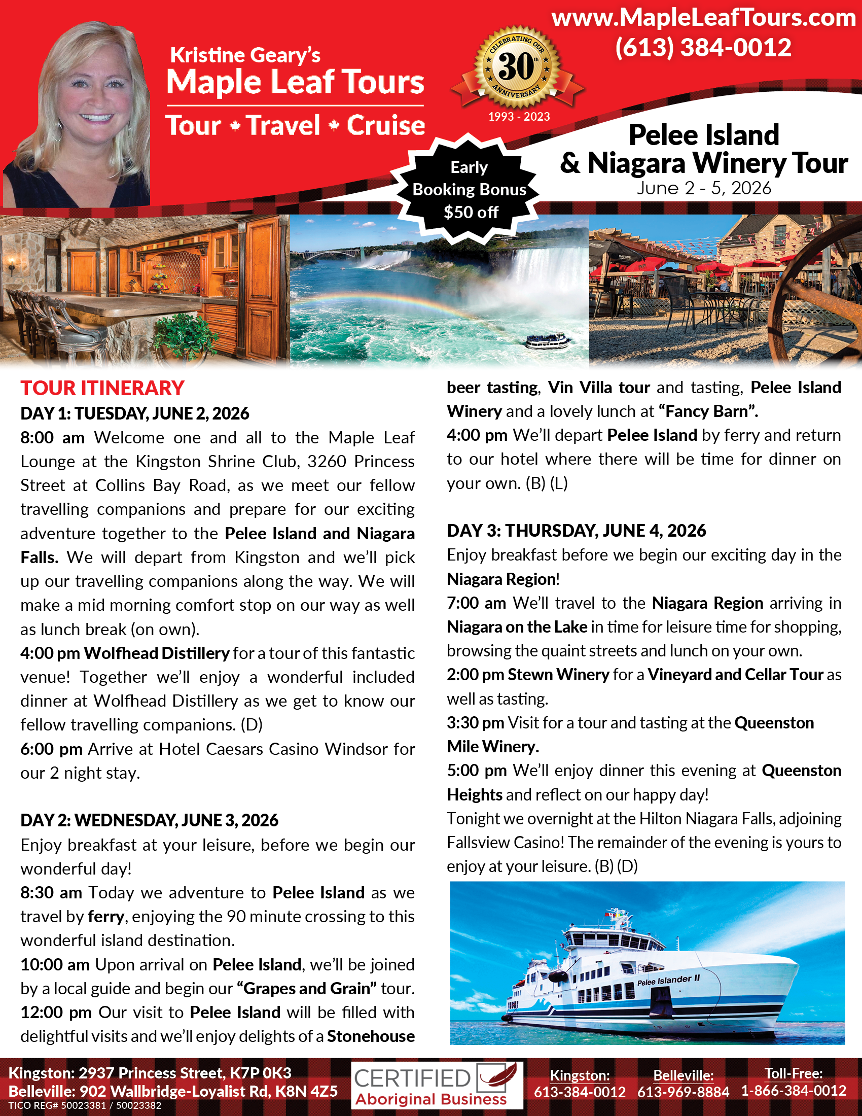 Join us as we visit Pelee Island and the Niagara Region for a wonderful Summer tour. Our local guide will take us on a “Grapes to Grains” tour, we will visit Niagara-On-The-Lake, with an optional visit to Casino Windsor!