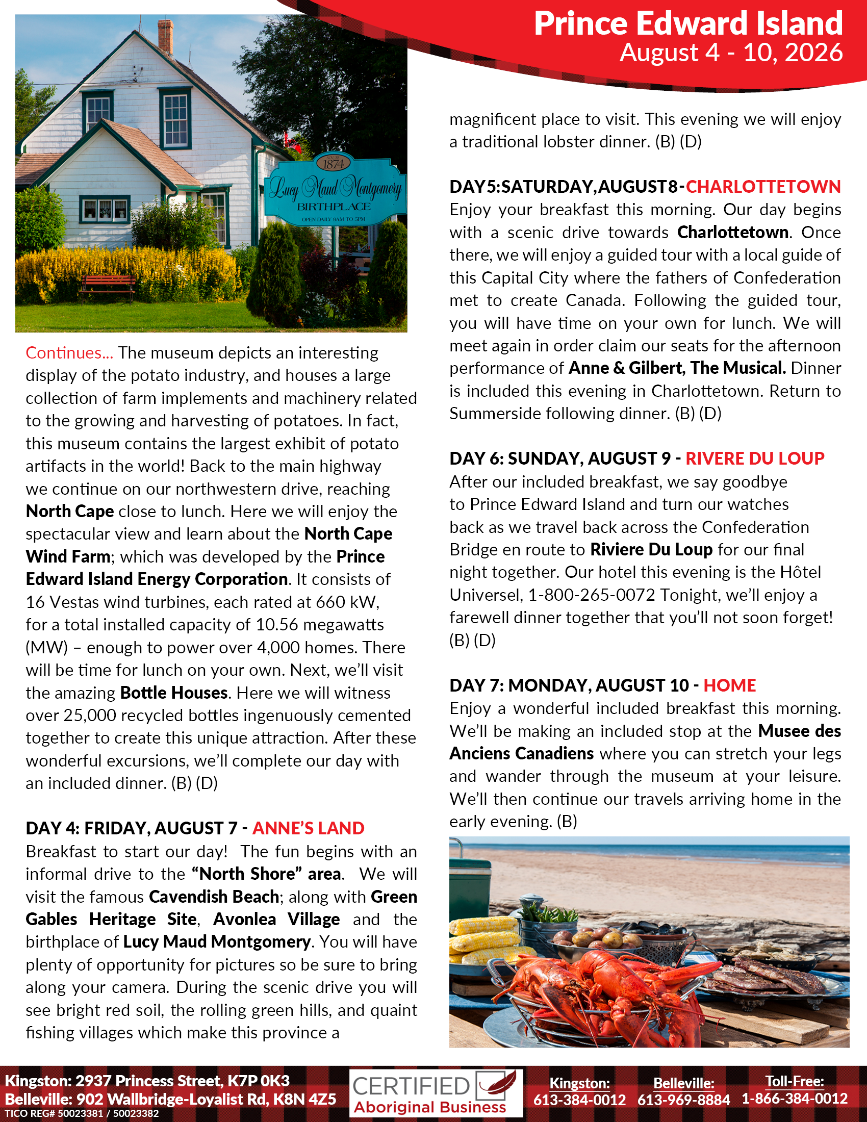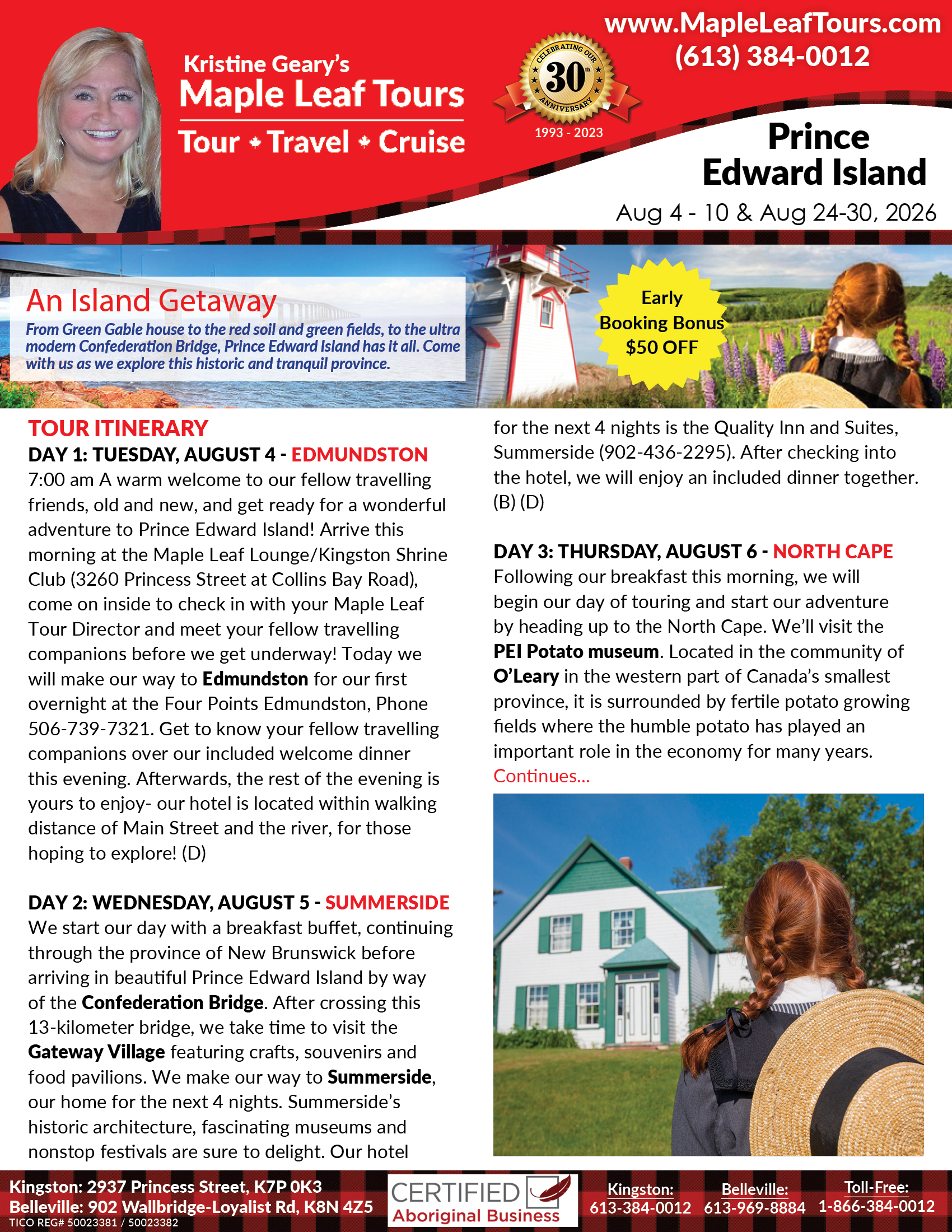 Join us as we visit Prince Edward Island, see the home of the famed red haired orphan at Anne of Green Gables Heritage Park and Avonlea Village. Visit the picture perfect Cavendish Beach, enjoy stops at Cows Creamery, Green Gables House, PEI Potato Museum and so much more!