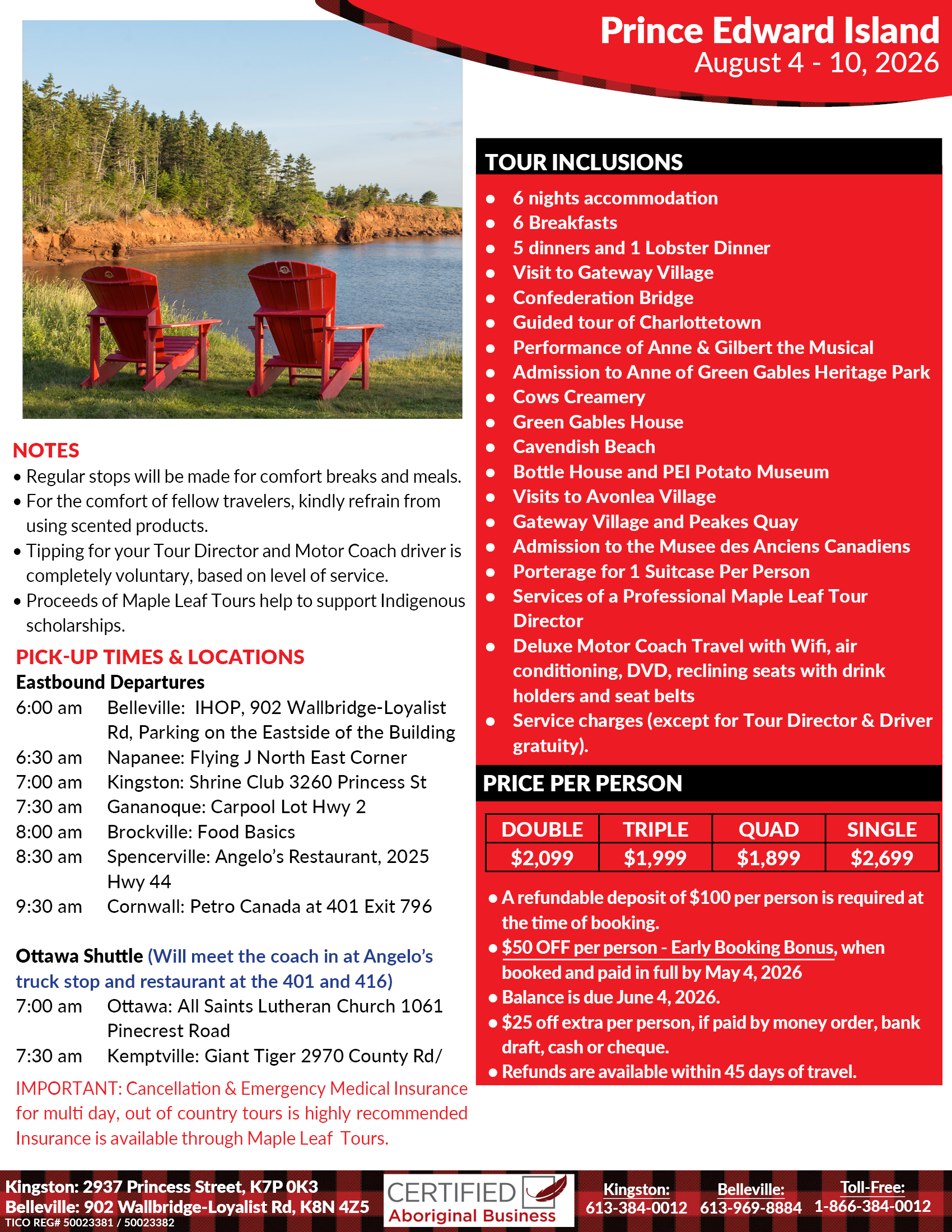 - A portion of the proceeds from this Maple Leaf Tour helps to support Indigenous Scholarships