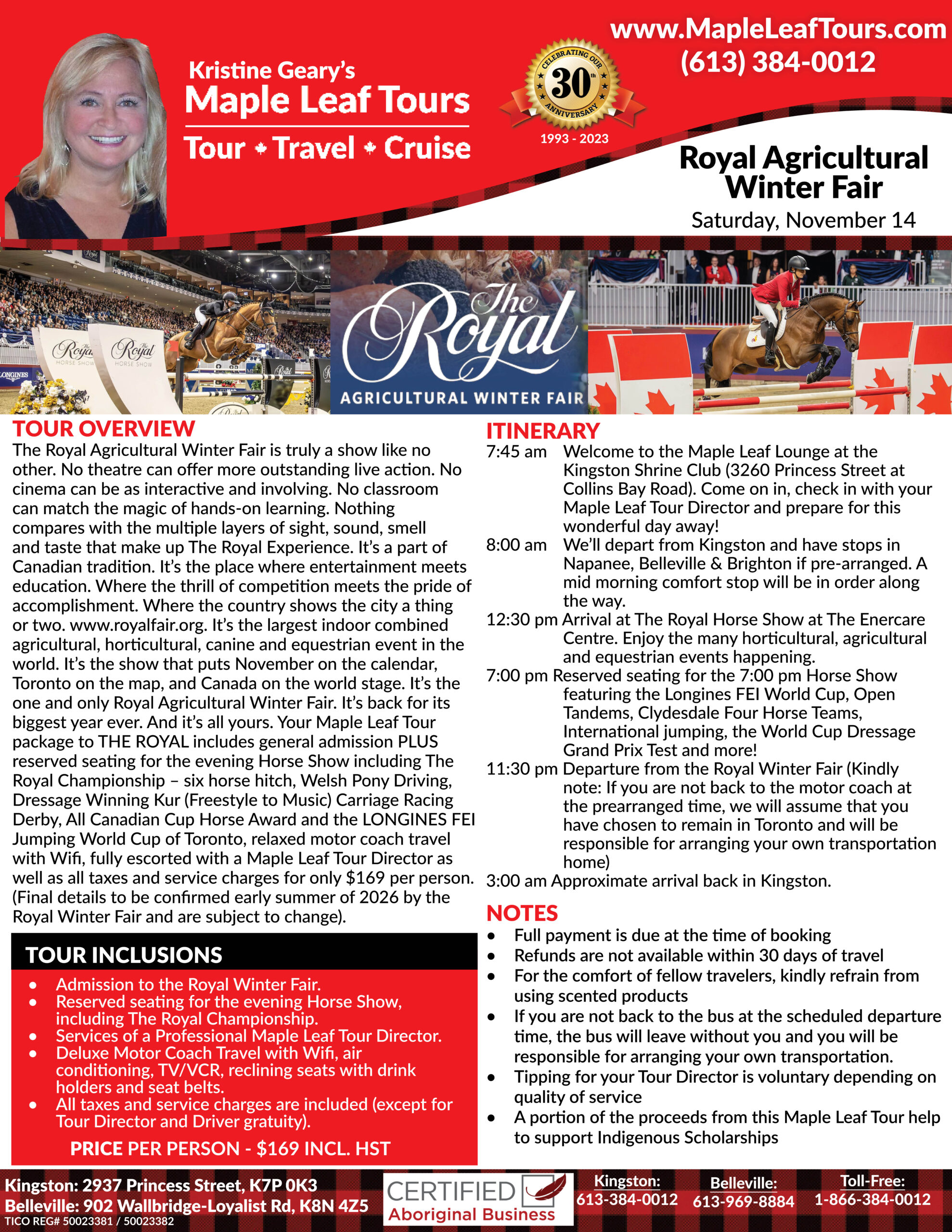 - 11:30 pm Departure from the Royal Winter Fair (Kindly note: If you are not back to the motor coach at the prearranged time, we will assume that you have chosen to remain in Toronto and will be responsible for arranging your own transportation home).