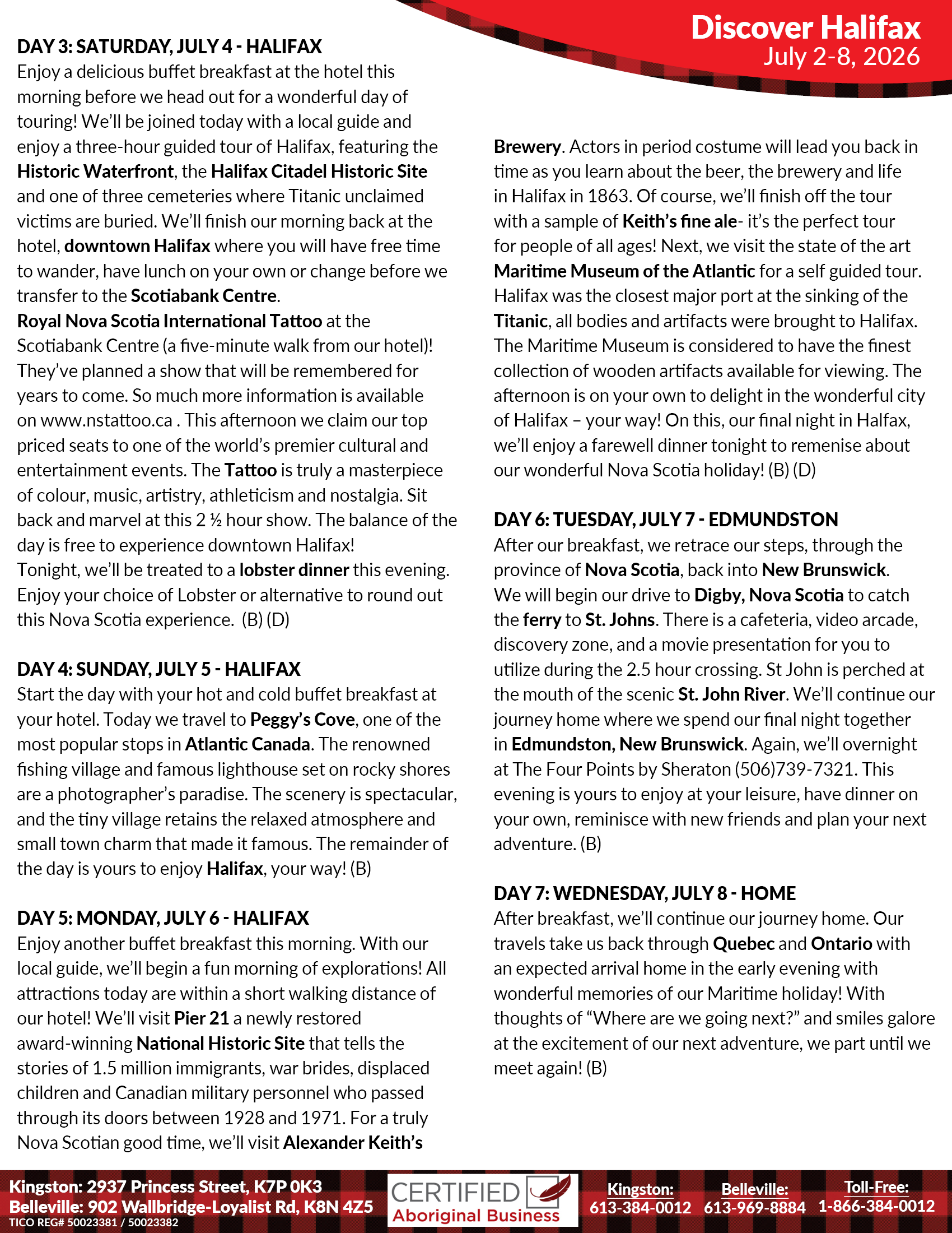 Today we travel to Peggy’s Cove, one of the most popular stops in Atlantic Canada. The renowned fishing village and famous lighthouse set on rocky shores are a photographer’s paradise. The scenery is spectacular, and the tiny village retains the relaxed atmosphere and small town charm that made it famous. The remainder of the day is yours to enjoy Halifax, your way! (B)