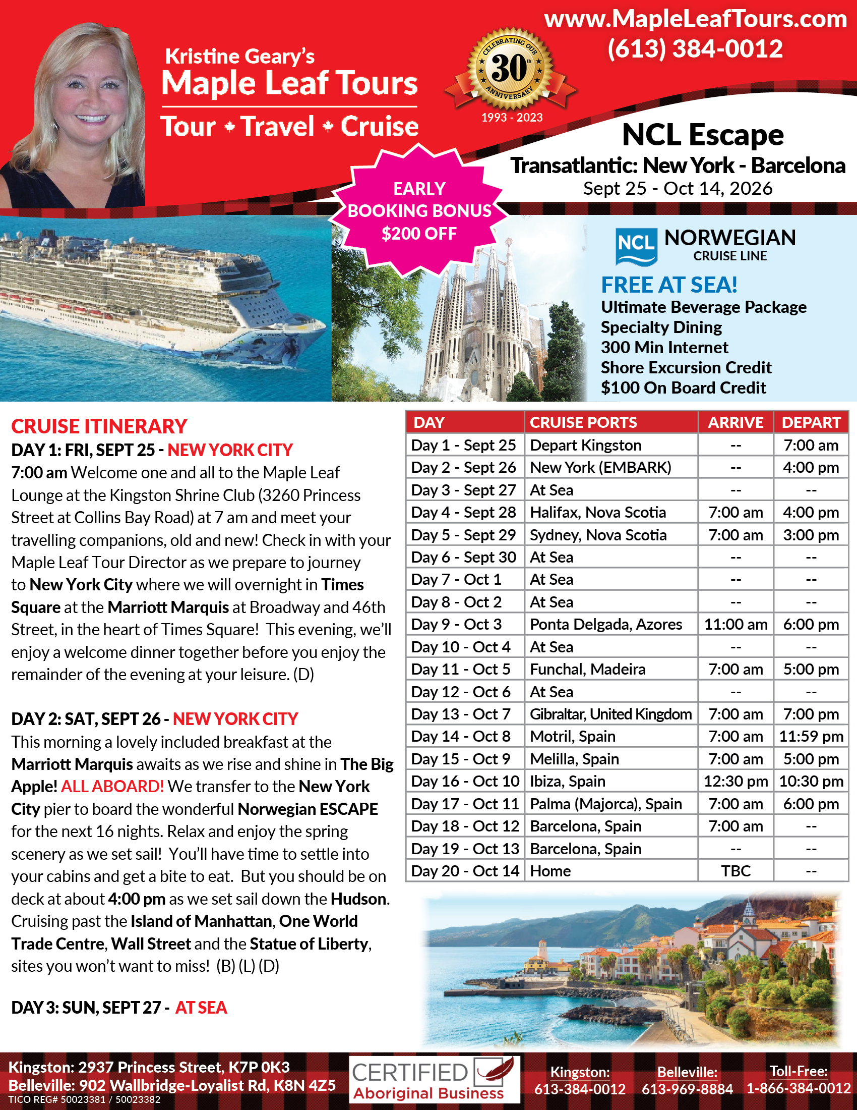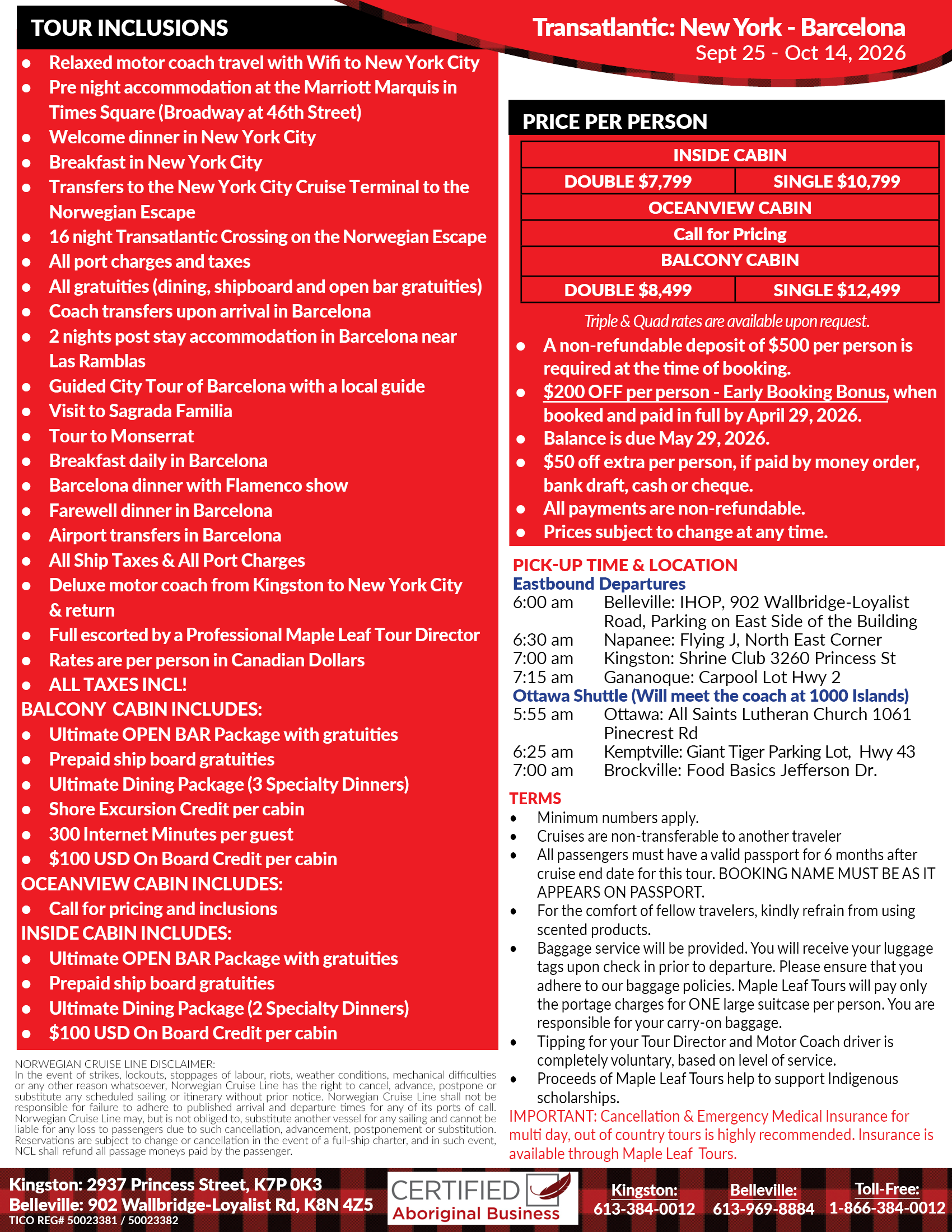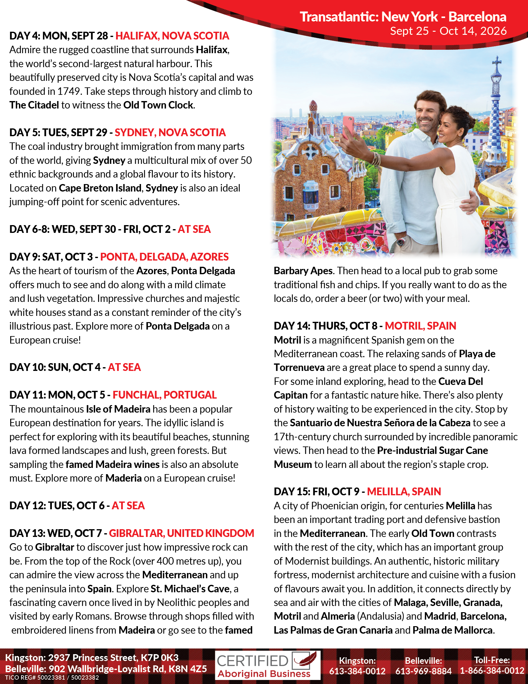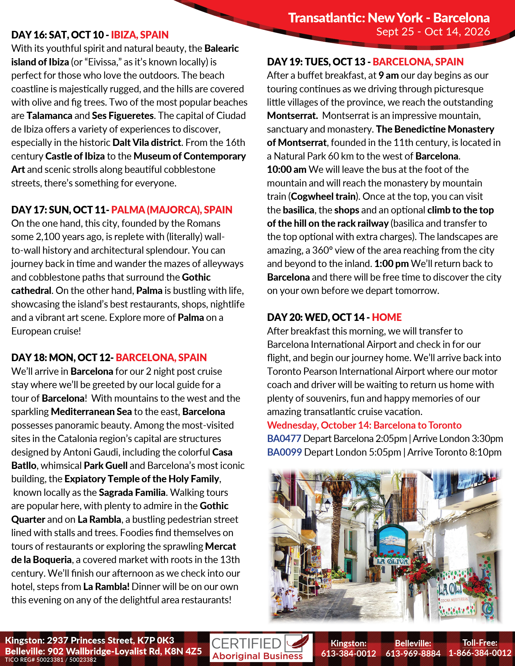 After breakfast this morning, we will transfer to Barcelona International Airport and check in for our flight, and begin our journey home. We’ll arrive back into Toronto Pearson International Airport where our motor coach and driver will be waiting to return us home with plenty of souvenirs, fun and happy memories of our amazing transatlantic cruise vacation.