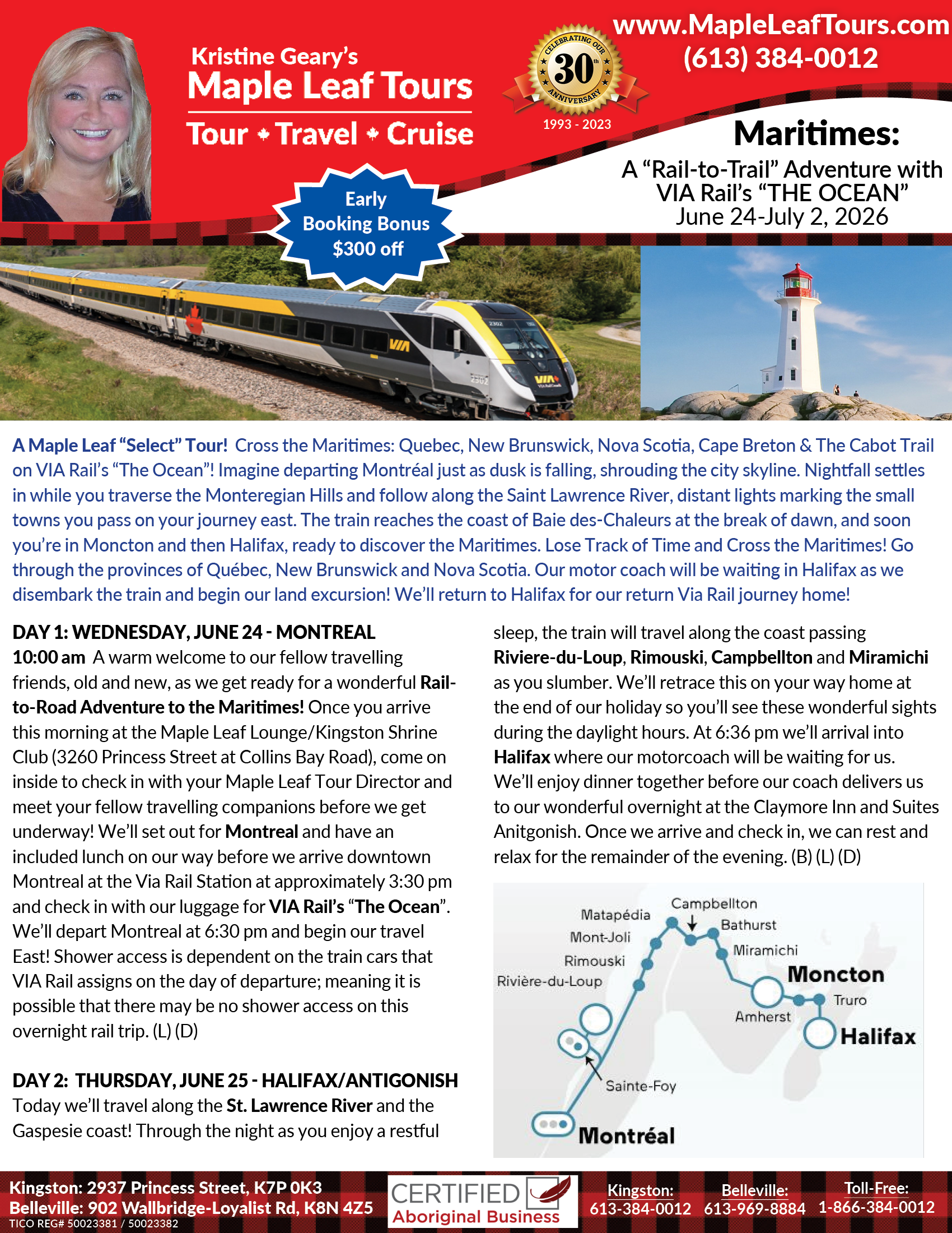 A Maple Leaf “Select” Tour! Cross the Maritimes on VIA Rail’s “The Ocean”! Imagine departing Montréal just as dusk is falling, shrouding the city skyline. Nightfall settles in while you traverse the Monteregian Hills and follow along the Saint Lawrence River, distant lights marking the small towns you pass on your journey east. The train reaches the coast of Baie des-Chaleurs at the break of dawn, and soon you’re in Moncton and then Halifax, ready to discover the Maritimes. Lose Track of Time and Cross the Maritimes! Go through the provinces of Québec, New Brunswick and Nova Scotia. Our motor coach will be waiting in Halifax as we disembark the train and begin our land excursion! We’ll return to Halifax for our return Via Rail journey home!