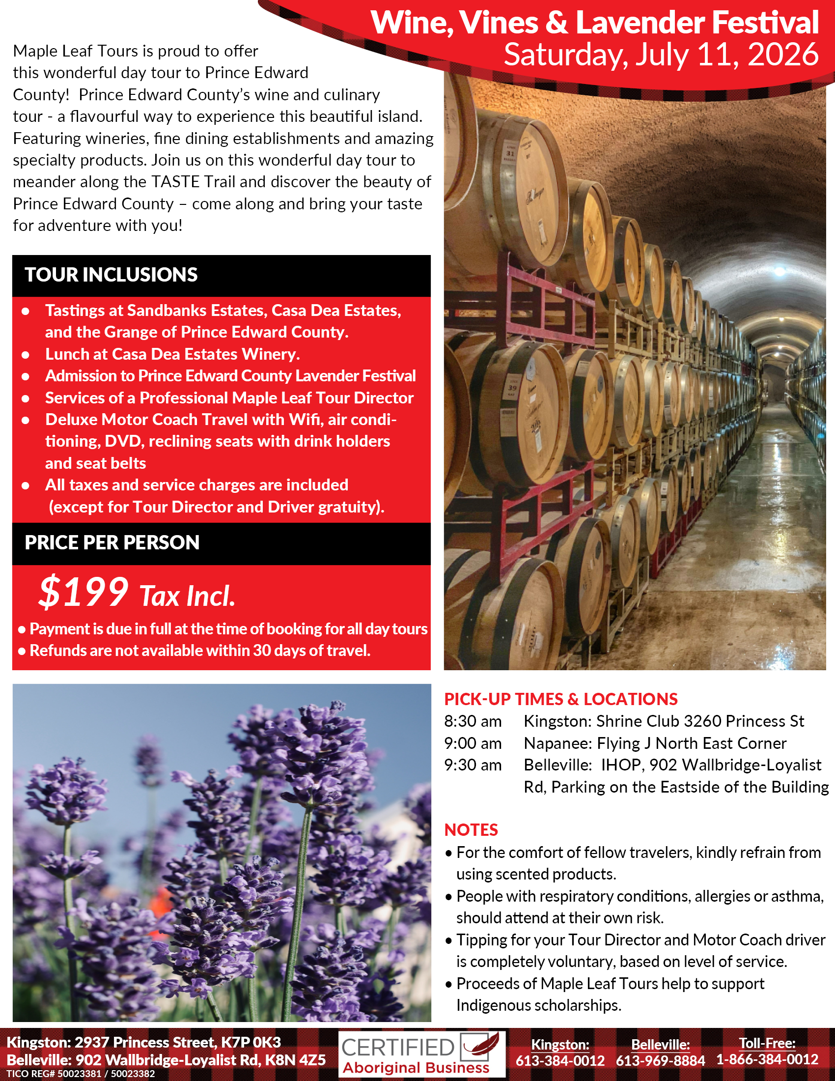 8:00 am Welcome to the Maple Leaf Lounge at the Kingston Shrine Club (3260 Princess Street at Collins Bay Road). Come on it, check in with your Maple Leaf Tour Director and prepare for this wonderful day away!